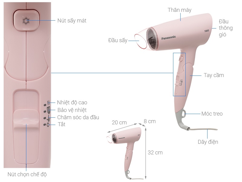 Máy sấy tóc Panasonic với thiết kế nhỏ gọn, dễ cầm nắm cùng công suất hoạt động mạnh mẽ 1800W giúp tóc nhanh khô, tiết kiệm thời gian sấy tóc Có 2 tốc độ sấy