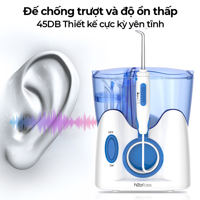 Máy tăm nước H2ofloss HF-9 là dòng máy tăm nước để bàn dùng cho gia đình chuyên nghiệp. Đi kèm 12 đầu tăm thay thế: 4 đầu tăm tiêu chuẩn, 2 đầu dành cho chỉnh nha/niềng răng, 2 đầu cho nha chu, 2 đầu cho lưỡi, 2 đầu cho mũi. Dung tích bình nước 800ml. Máy tăm nước H2ofloss HF-9 có 6 chế độ cài đặt áp lực nước trong đó có 1 chế độ tạm dừng “Pause”. Áp lực nước có thể điều chỉnh ở rải rộng từ 5-110 PSI. Đáp ứng tối đa nhu cầu của nhiều người dùng, và nhiều tình trạng răng miệng. Chỉ cần chọn một mức độ phù hợp bạn sẽ thấy việc sử dụng máy tăm nước H2ofloss rất dễ dàng và thoải mái. Máy tăm nước H2ofloss HF-9 là bản nâng cấp của HF-8. Thiết kế mới giúp máy giảm độ ồn tốt hơn HF-8 và có độ yên tĩnh hơn nhiều so với hầu hết các thương hiệu trên thị trường. Theo thông số kỹ thuật hãng đưa ra. Độ ồn của HF-9 là <50db. Các hãng máy khác có độ ồn ở mức < 70db. Máy tăm nước H2ofloss HF-9 có khả năng tự ngừng hoạt động khi quá nóng và có thể khởi động lại sau 2h giúp duy trì độ bền tốt hơn. THÔNG SỐ KỸ THUẬT MÁY TĂM NƯỚC H2OFLOSS HF-9