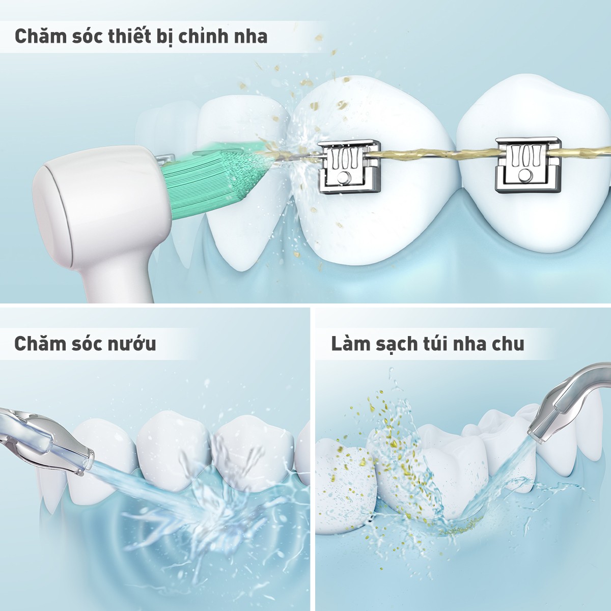 Khi chỉnh nha (xích răng) thì việc làm sạch răng và các đầu giữ là việc cần quan tâm khi mà bản chải không thể dùng được. Máy tăm nước MAXVI với vòi đầu cước