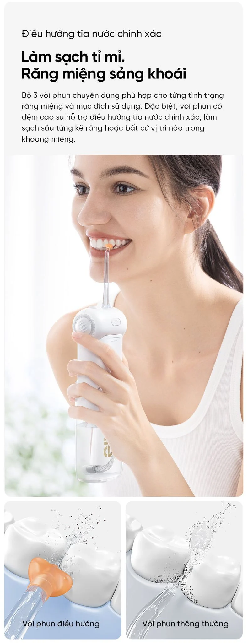 Được trang bị bộ 3 vòi phun chuyên dụng, usmile C10 hỗ trợ vệ sinh toàn diện các ngóc ngách sâu bên trong khoang miệng. Đặc biệt, Vòi phun điều hướng trang bị đệm cao su mới đảm bảo làm sạch các kẽ răng khít nhất một cách êm ái.