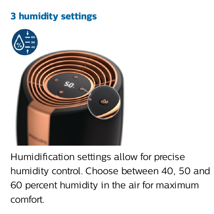 - Những hạt nước với kích cỡ nano nhờ công nghệ xông hơi NanoCloud sẽ giúp giảm đi 99% vi khuẩn trong phòng. -️ Máy làm ẩm của Philips cho phép bạn lựa chọn độ ẩm từ 40, 50 và 60% cho sự thoải mái tối đa. - Đèn báo màu đỏ cho bạn biết bồn chứa nước cần được làm đầy. -️ Khi bồn chứa nước cạn, máy sẽ tự động tắt. -️ Có 3 chế độ lựa chọn tốc độ làm ẩm: Thấp, bình thường và nhanh. Thông số kỹ thuật: