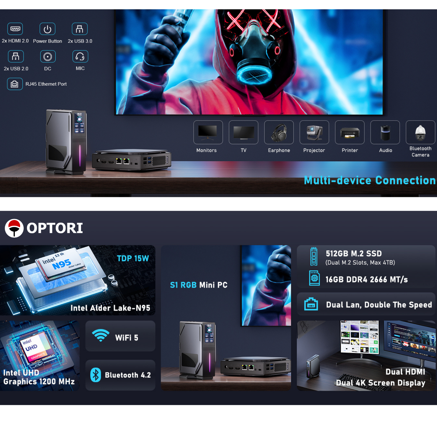 Máy có khả năng nâng cấp ổ cứng không giới hạn với 2 khe SSD chuẩn M.2 2280 PCle/NVME , NUC JK01 cho chất lượng output Dual screen tại cổng HDMI siêu nét, xung nhịp đến tận 60 Hz; hỗ trợ độ phân giải lên đến 4096*2160 @60Hz cho phép thưởng thức film ảnh chất lượng 4K một cách chân thật nhất. Máy còn tích hợp sẳn chip wifi mạnh mẽ, dễ dàng kết nối các tầng số sóng từ 2.4GHz + 5.8GHz dual band WiFi và hỗ trợ kết nối cổng LAN 1000Mbps Ethernet.