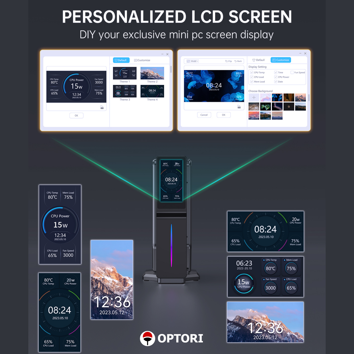 Đặc biệt Mini PC JK01 thiết kế giao diện màn hình LCD cho phép tùy chỉnh theme, cùng LED RGB đẹp mắt trên thân máy, giúp không gian làm việc của bạn trở nên thật sống động và nổi bật