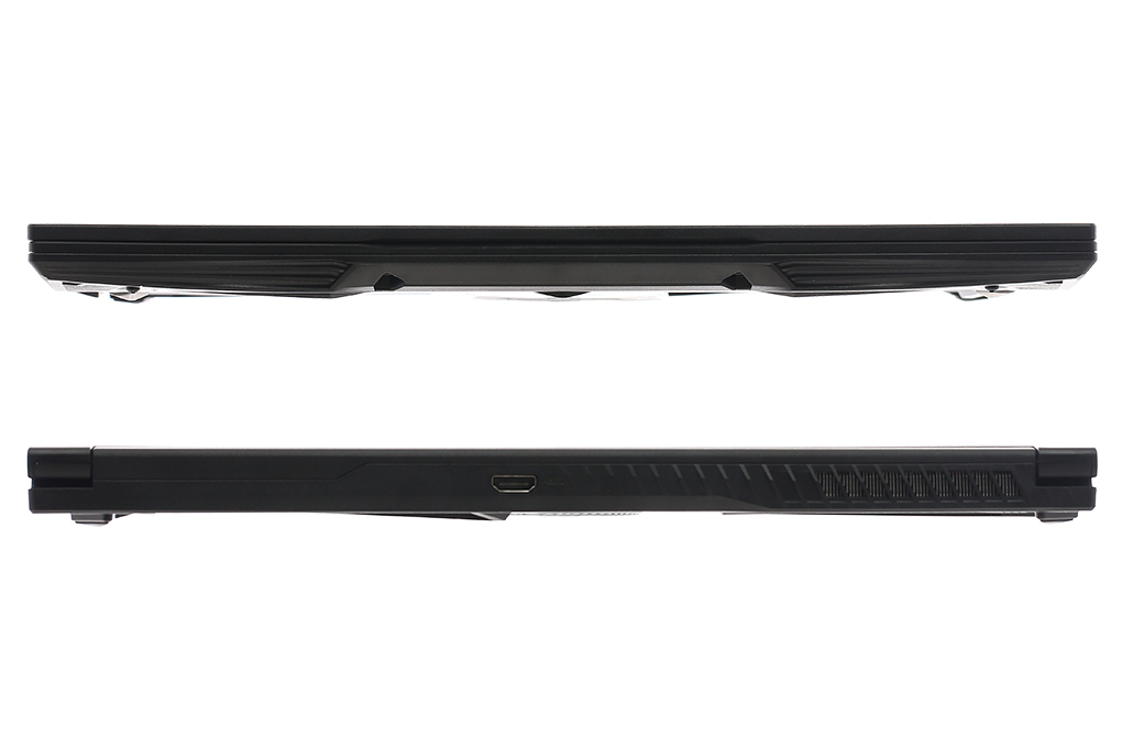 Toàn thân MSI GF63 có màu đen chủ đạo với những điểm nhấn màu đỏ như logo MSI. Phần quạt thông gió hình chữ X ẩn dưới thân máy, tạo nên sự thanh thoát và liền khối trong thiết kế tổng thể.