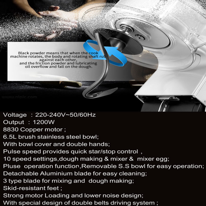 - Chân đế thiết kế đặc biệt có khả năng chống rung và trơn trượt khi máy hoạt động. Thông số kỹ thuật: – Dung tích: 6.5 lít – Số lượng bột đánh tối đa: 1,5kg – Điện áp: 220-240V 50/60Hz – Công suất: 1200W – Máy có 10 tốc độ đánh khác nhau – Kích thước máy: 51.53037.5cm – Trọng lượng: 5.5kg Hướng dẫn sử dụng