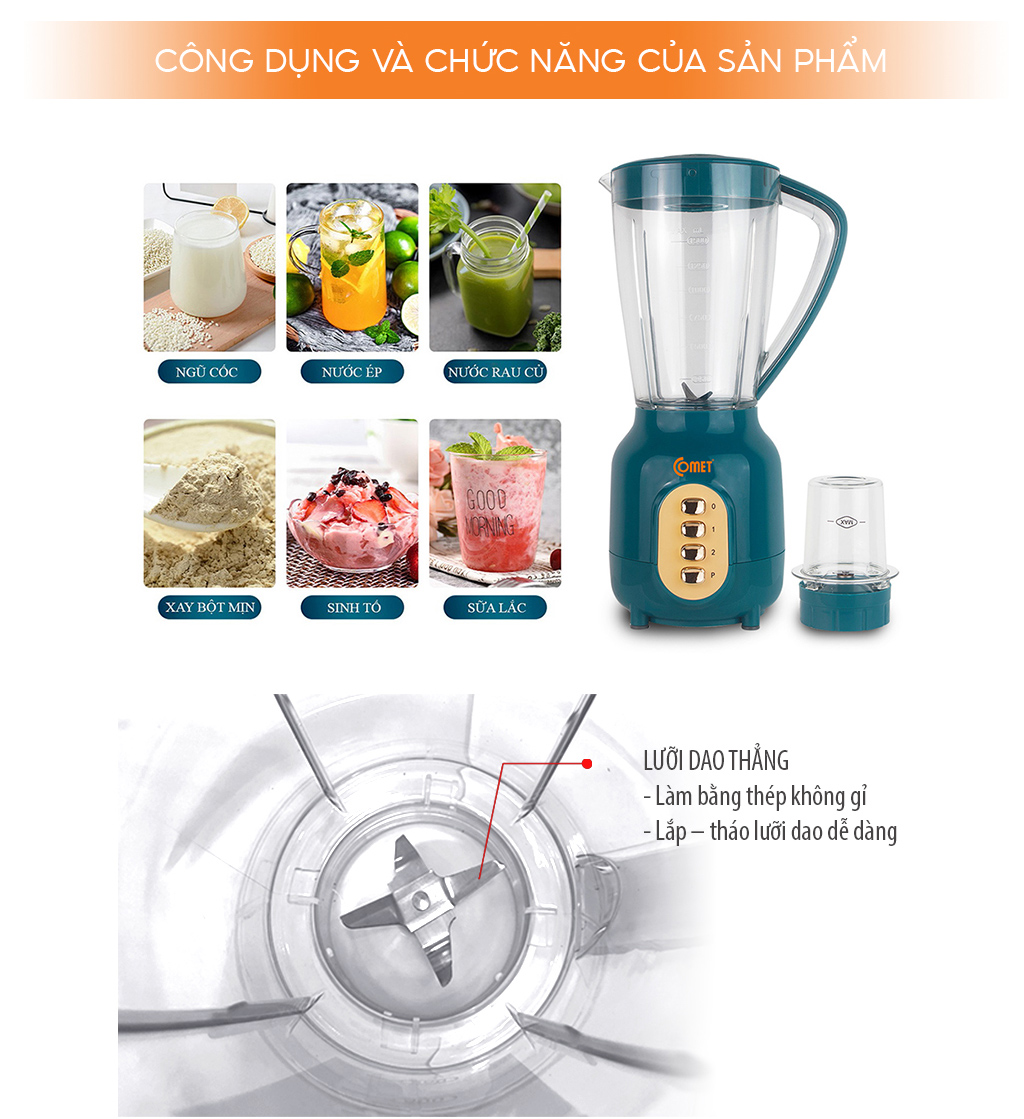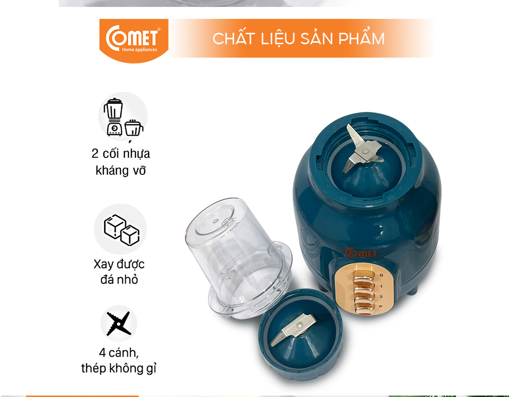 Thông Tin Chi Tiết Thương hiệu Comet Dung tích 1.5L Chất liệu cối xay Nhựa ABS Công suất 350W Mô Tả Sản Phẩm Đa chức năng và chịu được lực xay lớn Sản phẩm được