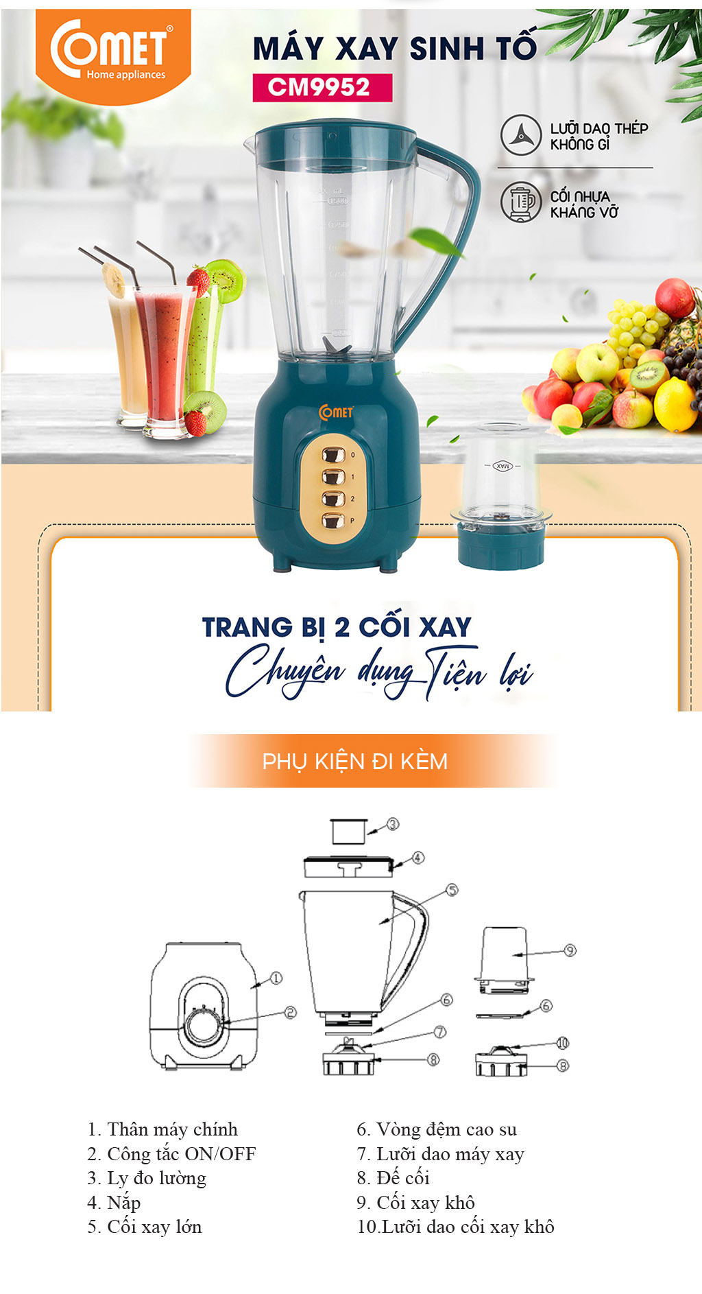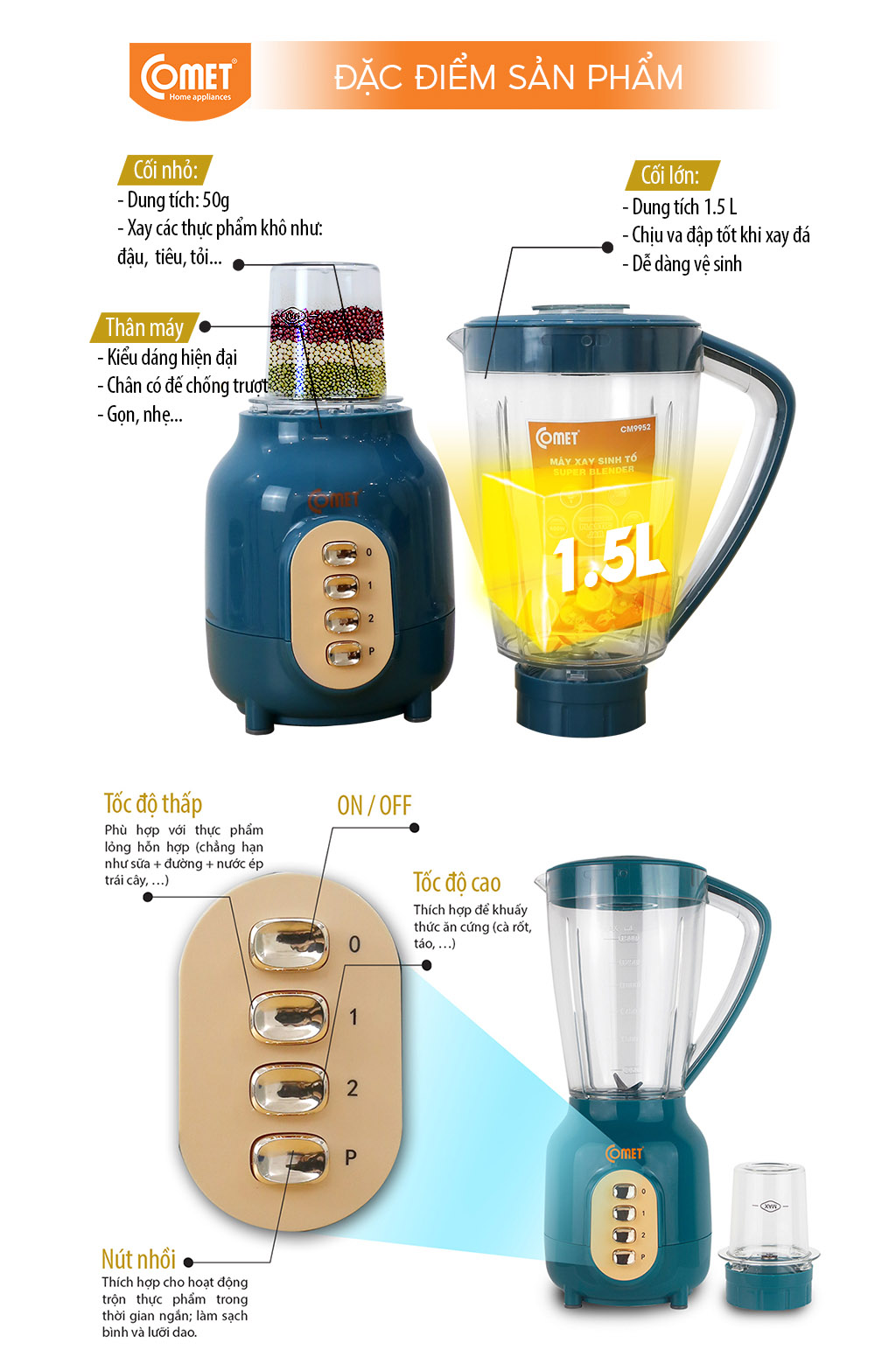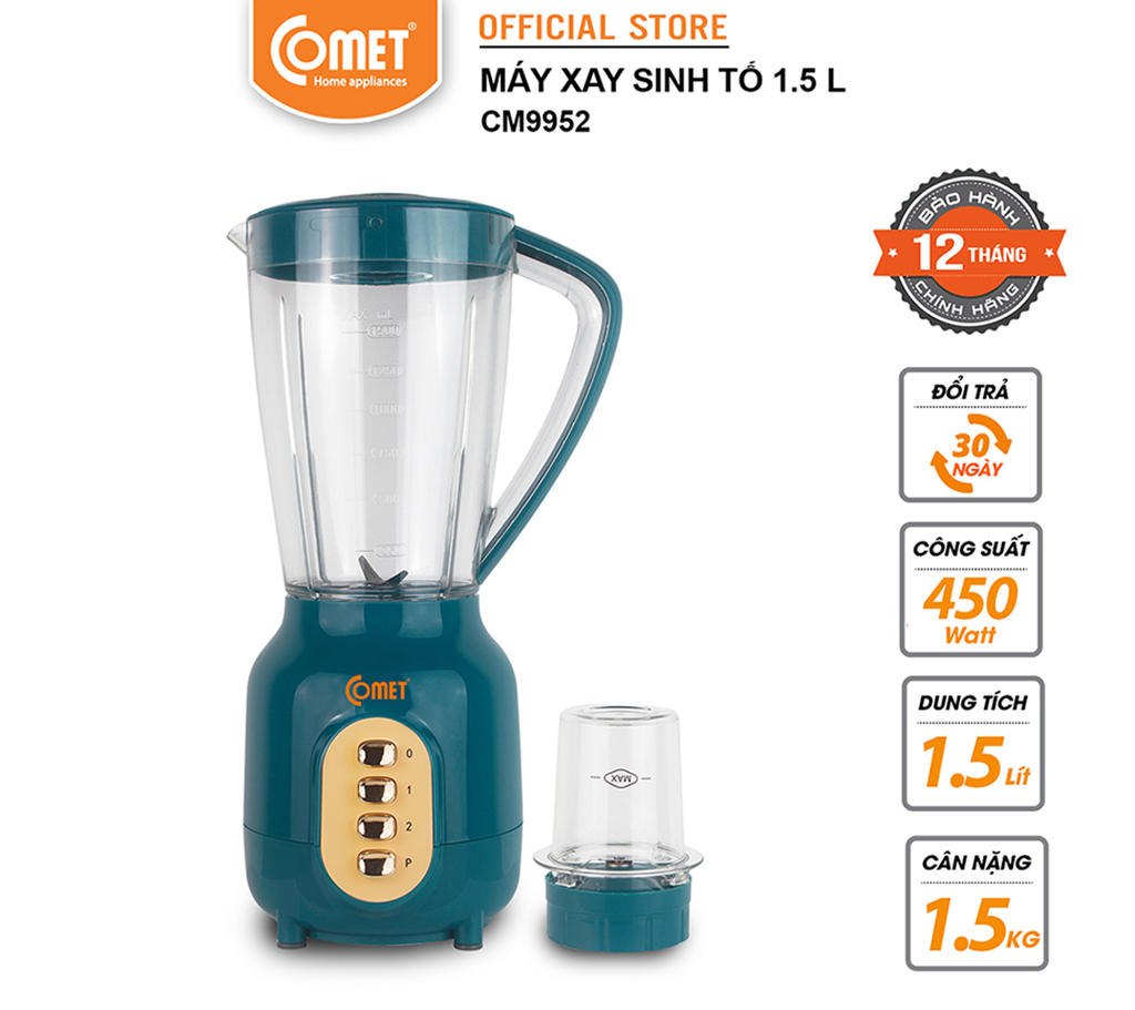 - Máy xay sinh tố Comet CM9952 có kiểu dáng hiện đại, màu sắc trẻ trung, giúp căn bếp trở nên tươi mới hơn bao giờ hết. Công suất mạnh mẽ -