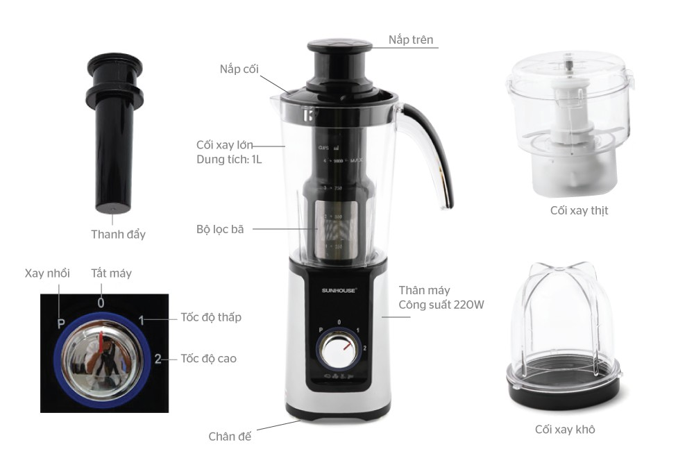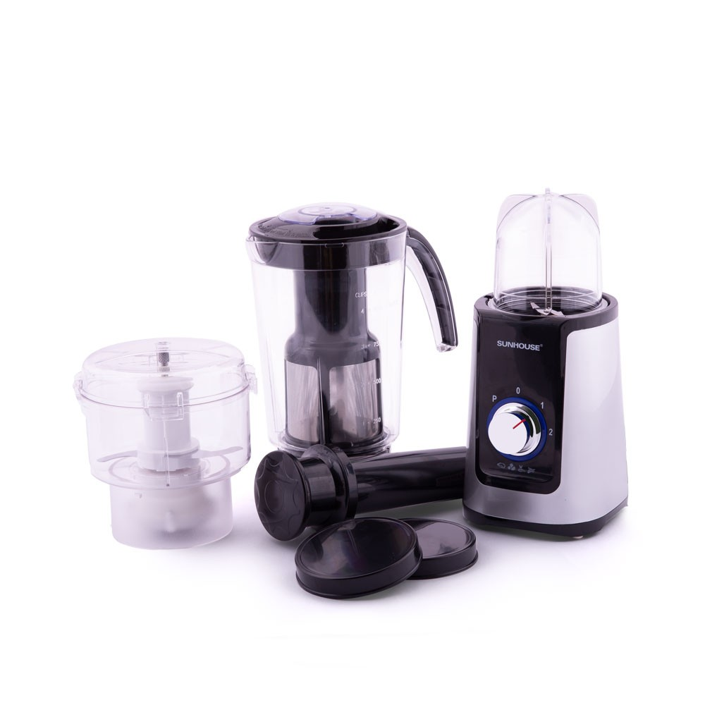 Máy xay sinh tố đa năng SUNHOUSE SHD5322B có thiết kế hiện đại với một cối xay sinh tố kèm lưới lọc bã và 1 thanh đẩy giúp bạn xay trái cây được nhanh hơn, sánh mịn hơn. Bên cạnh đó là 1 cối xay thực phẩm khô và 1 cối xay thịt, đáp ứng mọi nhu cầu làm bếp của bạn.