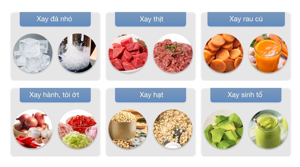 -Ngoài ra, máy xay sinh tố còn có lưỡi dao 4 cánh dùng cho cối xay thịt và lưỡi dao 2 cánh dùng cho cối xay hạt. Các lưỡi dao đều có thể dễ dàng tháo rời để vệ sinh sau khi sử dụng vô cùng tiện lợi.