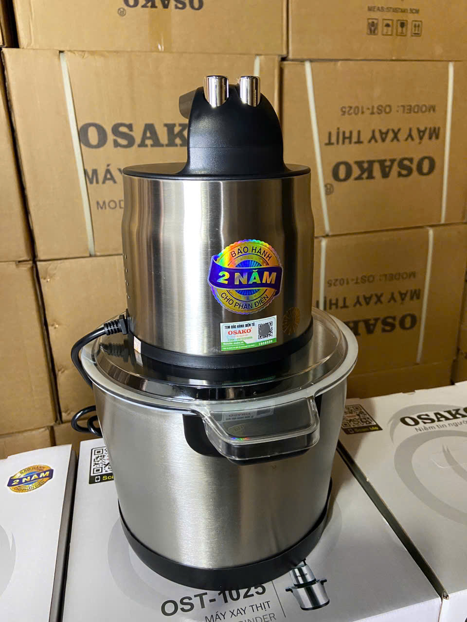 \ THÔNG SỐ KỸ THUẬT Tên sản phẩm: Máy xay thịt 950W Dung Tích 5.8L Osako OST-1025- kèm 1 lưỡi dao dự phòng Thương hiệu : OSAKO Loại máy: Máy xay thịt/máy xay thịt công nghiệp/máy xay thịt cho quán/máy xay thịt cho nhà hàng/máy xay đa năng/máy xay dung tích lớn/máy xay hạt cứng/máy xay thực phẩm/máy xay giò chả/máy xay thịt 6L/Máy xay thịt 1000W/Máy xay thịt công suất lớn/máy xay thịt đa năng/máy xay tỏi ớt Điện áp: 220V - 50Hz Công suất: 950W Dung tích: 5.8L Chất liệu cối: Inox 304 Chất liệu lưỡi dao: Inox chuyên dụng Chất liệu trục - nhông: Hợp kim Tốc độ xay: 2 tốc độ Động cơ: Lõi đồng, có quạt tản nhiệt An toàn: Rơ le cảm biến tự ngắt khi quá tải Linh kiện đi kèm: Đế chống ồn, vá gỗ, dao nhựa và 1 lưỡi dao dự phòng Linh kiện thay thế: Có đầy đủ khi cần thiết Xuất xứ thương hiệu: Chính hãng Osako    \   VÌ SAO BẠN NÊN CHỌN MÁY XAY THỊT OSAKO 6L? CÔNG SUẤT 1000W Hầu hết các máy xay thịt đều sử dụng công suất nhỏ dẫn đến lượng thịt xay ít, dễ quá tải. Với máy xay thịt công suất 1000W của #Osako, bạn có thể xay nhiều thịt cá hơn, xay nhanh hơn     QUẠT TẢN NHIỆT ĐỘNG CƠ Động cơ có gắn quạt tản nhiệt và thiết kế khe thoát hơi hóng, thiết kế này chỉ có ở máy xay thịt Osako OST-1025. Hệ thống tản nhiệt làm cho động cơ lâu nóng hơn, đảm bảo tuổi thọ cho máy   CỐI INOX 304 DUNG TÍCH 5.8L Thiết kế cối xay bằng inox 304 tránh tình trạng bể vỡ khi chị em vô tình làm rơi hoặc va chạm mạnh. Tiết kiệm được chi phí khi không cần thay thế linh kiện Inox 304 rất cứng, không hoen rỉ, không bị bám mùi như nhựa và khó bị bám dính bởi các thực phẩm như dầu mỡ nên rất dễ vệ sinh       TRỤC LƯỠI DAO - NHÔNG MÁY BẰNG HỢP KIM CHỐNG MÀI MÒN Đối với máy xay, đầu trục lưỡi dao và nhông của máy là bộ phận dễ hư hỏng nhất do phần lớn đều làm bằng nhựa. Do đó khi xay nhiều, hoặc lắp đặt không khớp cũng dễ dàng hư hỏng. Và linh kiện thay thế tìm kiếm cũng khó khăn Máy xay thịt Osako sử dụng trục - nhông bằng hợp kim nên tình trạng hư hỏng hầu như không xảy ra, ngoài ra hợp kim khó mòn nên đảm bảo độ khớp, cho máy xay không bị rung và ồn         BỘ DAO 4 LƯỠI INOX CÓ THỂ THÁO RỜI Lưỡi dao thiết kế thành 2 tầng, có thể tháo rời để vệ sinh hoặc khi xay lượng thịt cá nhỏ Chất liệu inox cứng, sắc bén, kết hợp với công suất 950W xay nhuyễn thịt nhanh chóng   LINH KIỆN THAY THẾ CÓ SẴN Các linh kiện luôn đủ để đáp ứng nhu cầu thay thế của người sử dụng       Lưu ý khi sử dụng: do công suất máy cực mạnh xay cực nhanh nên xay khoảng 40-50s hãy cho máy tạm nghỉ vài giây rôi xay tiếp,do tính chất cảm biến máy quá tải sẽ tự ngắt để đảm bảo an toàn,khi sử dụng nên khi sử dụng nên xay từ từ và có thời gian nghỉ cho máy để tránh quá tải máy sẽ tự ngắt.