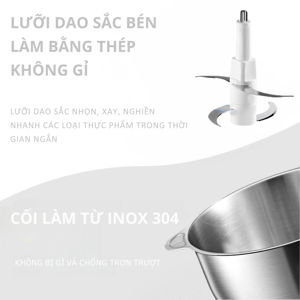 - Lưỡi dao của máy xay thịt được thiết kế bằng Inox có độ sắc bén cao, thiết kế 4 lưỡi, 2 tầng dao giúp tối ưu tốt khi sử dụng. LƯU ý: Chỉ nên cho khoảng nửa cối xay để đảm bảo quá trình xay được tốt nhất.