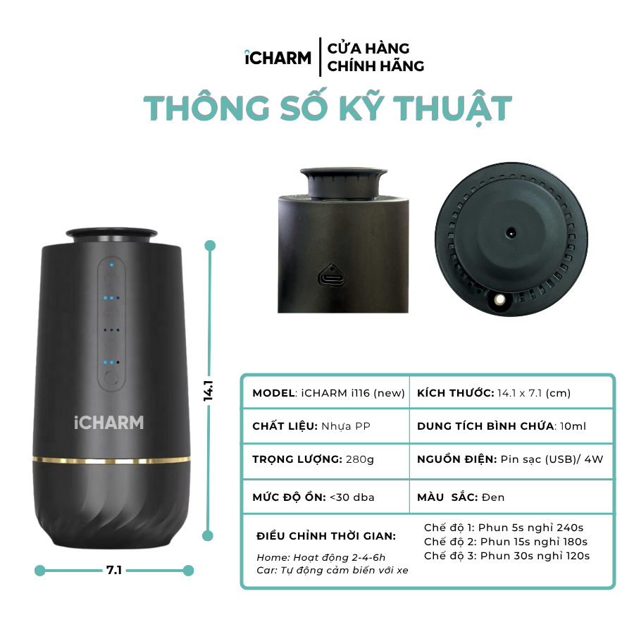 - Chế độ 3: Máy phun trong 6H và sau đó tự động tắt Ưu điểm của máy tạo mùi thơm ô tô: Công nghệ phun Nano Máy khuếch tán tinh dầu trực tiếp iCHARM sử dụng công nghệ phun Nano. Vì sử dụng tinh dầu nguyên chất nên máy có ưu điểm phun mạnh, tỏa hương nhanh và xa. Phun tự động Máy được tích hợp cảm biến, tự động phun khi xe nổ máy và tắt khi xe không hoạt động Tùy chỉnh mùi hương Ngoài khả năng hoạt động tự động, máy còn có thể tùy chỉnh mùi hương MẠNH - NHẸ theo sở thích của bạn. Độ ồn thấp Máy khuếch tán tinh dầu trong phòng, cửa hàng iCHARM có độ ồn bé (<db). Có thể ngủ và làm việc mà không bị ảnh hưởng Độ bền cao Sử dụng tinh dầu đúng cách và vệ sinh định kì sẽ giúp máy có độ bền cực kì cao. Sử dụng 24/24 Máy có thể hoạt động 24h liên tục mà không bị ảnh hưởng đến chất lượng, độ bền của máy. Chính sách bảo hành từ iCHARM Chu kỳ bảo hành: 1 năm , thời gian bắt đầu từ ngày sản phẩm được bán. Trong thời hạn bảo hành, chúng tôi sẽ cung cấp dịch vụ sửa chữa các bộ phận của máy miễn phí. Sản phẩm khi đến tay khách hàng sẽ có giấy hướng dẫn sử dụng, vui lòng đọc kĩ hướng dẫn sử dụng trước khi đổ tinh dầu vào máy. Trong trường hợp máy không chạy, gặp sự cố hoặc không cài đặt thời gian hay nồng độ phun được, quý khách vui lòng liên hệ chúng tôi để được hỗ trợ.