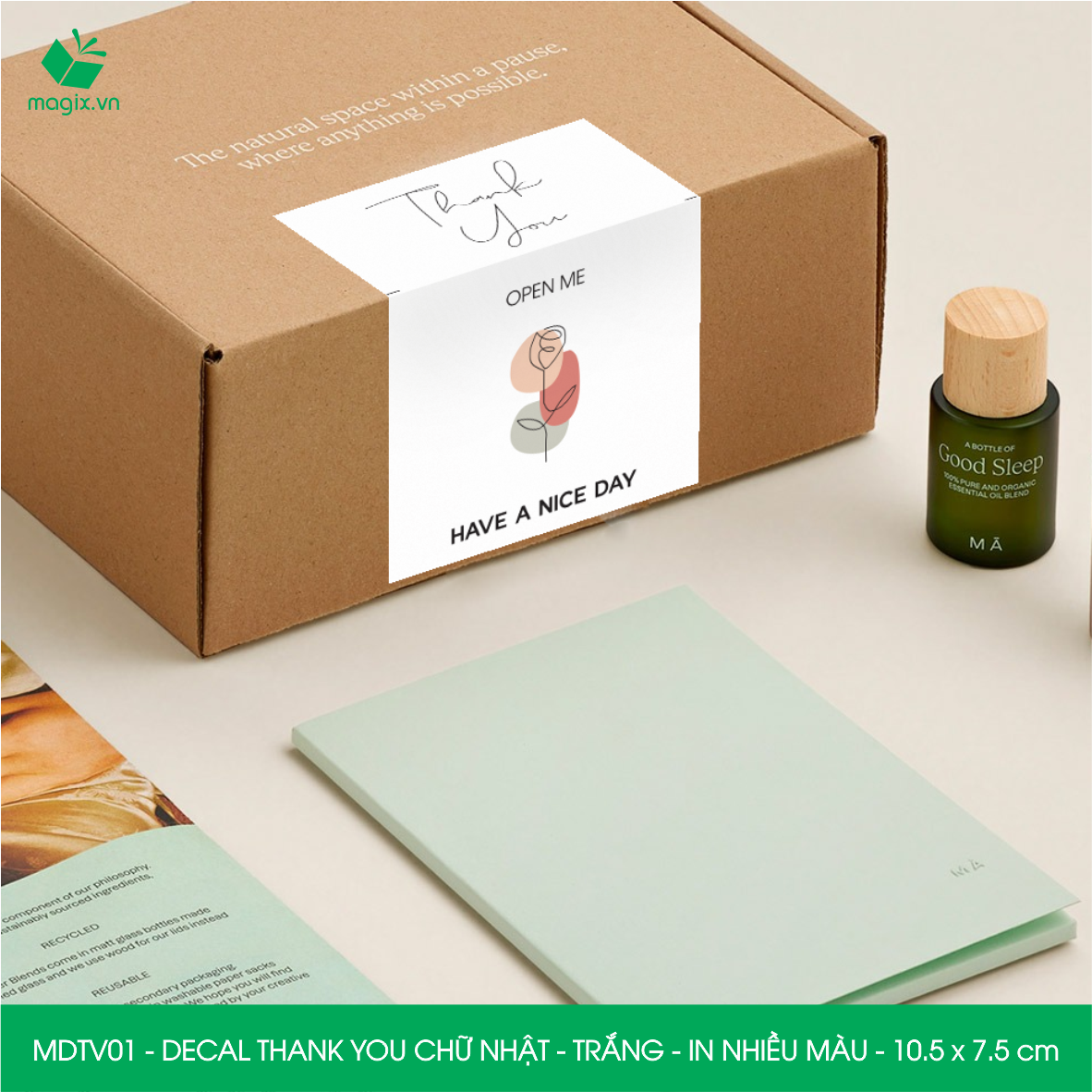 Decal - sticker Thank You là loại nhãn dán có nội dung "Cám ơn" được thiết kế theo hình chữ nhật. Decal Thank You thường được sử dụng để trang trí đóng gói thời trang,
