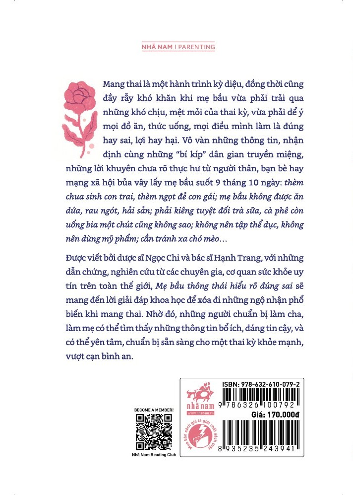 Được viết bởi dược sĩ Ngọc Chi và bác sĩ Hạnh Trang, với những dẫn chứng, nghiên cứu từ các chuyên gia, cơ quan sức khỏe uy tín trên toàn thế giới, Mẹ bầu thông thái hiểu rõ đúng sai sẽ mang đến lời giải đáp khoa học để xóa đi những ngộ nhận phổ biến khi mang thai. Nhờ đó, những người chuẩn bị làm cha, làm mẹ có thể tìm thấy những thông tin bổ ích, đáng tin cậy, và có thể yên tâm, chuẩn bị sẵn sàng cho một thai kỳ khỏe mạnh, vượt cạn bình an.