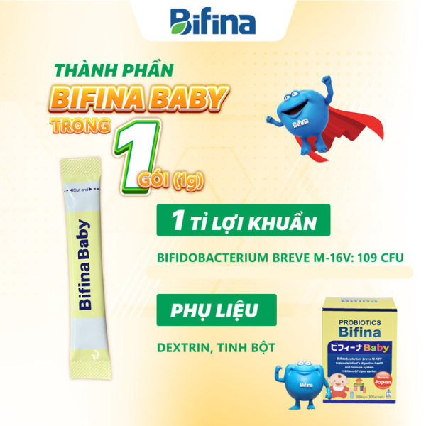 Mua tại TiktokMen vi sinh Bifina Baby Nhật Bản – Hộp 30 gói – Bổ sung lợi khuẩn, hỗ trợ hệ vi sinh khoẻ mạnh cho trẻ sinh non, sinh mổ, dùng sữa công thức Đối tượng sử dụng: Dành cho trẻ em từ 0 tháng tuổi cần bổ sung lợi khuẩn cho hệ tiêu hóa khỏe mạnh. Công dụng : Bổ sung lợi khuẩn, giúp hệ vi sinh đường ruột khỏe mạnh, hỗ trợ tiêu hóa và tăng cường sức đề kháng. Thành phần mỗi gói (1g):