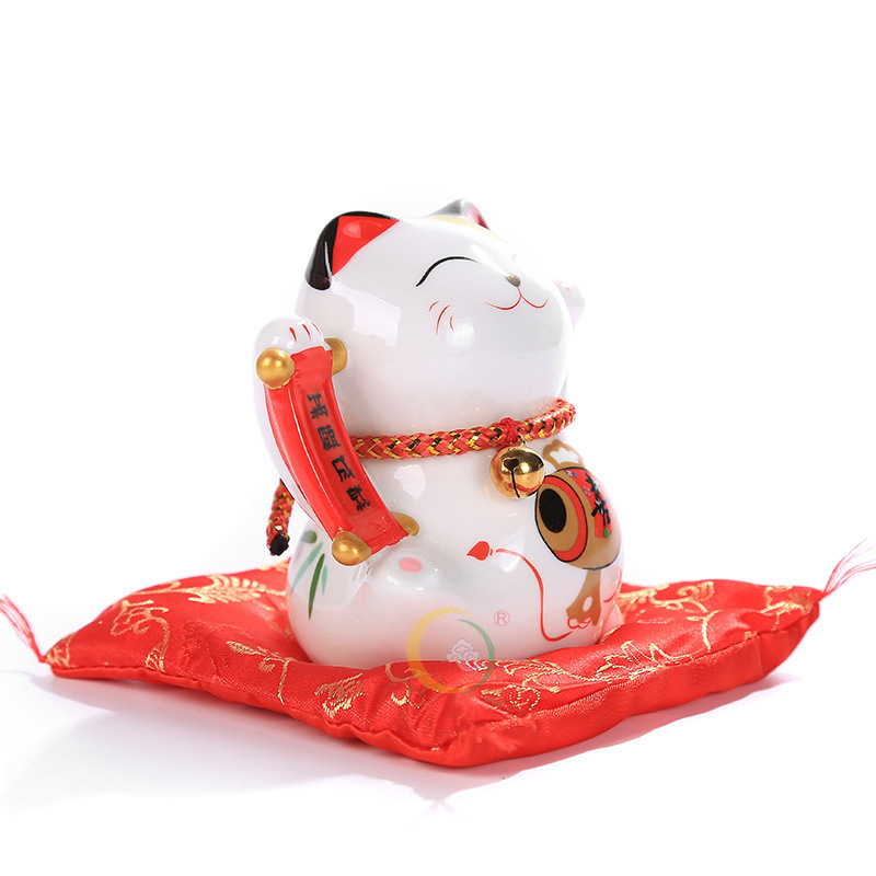 - Mèo thần tài được làm từ chất liệu gốm sứ cao cấp, để tránh bị đổ vỡ nên mèo được đặt trên tấm đệm bông in hoa đẹp mắt. Chú mèo có hình dáng