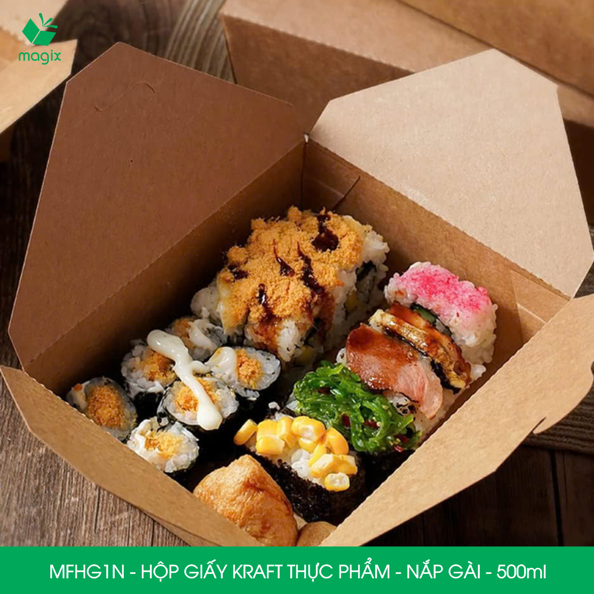 ✨MFHG1N - 100 hộp giấy kraft thực phẩm 500ml, hộp giấy nắp gập màu nâu đựng thức ăn, hộp giấy nắp gài gói đồ ăn mang đi
