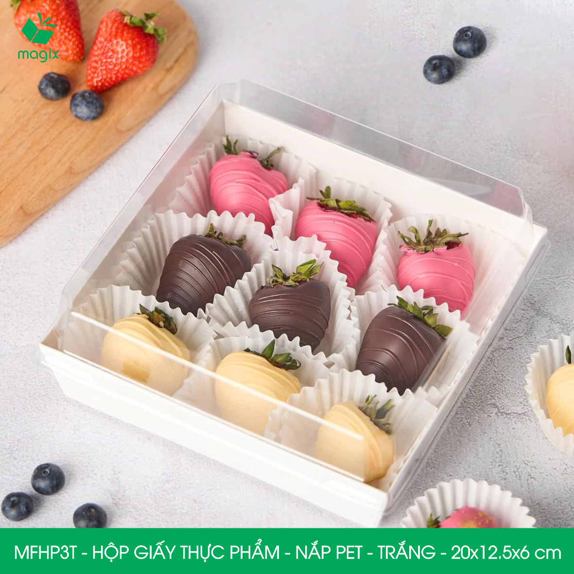 ✨MFHP3T - 20x12.5x6 cm - 100 hộp giấy thực phẩm màu trắng nắp Pet, hộp giấy chữ nhật đựng thức ăn, hộp bánh nắp trong