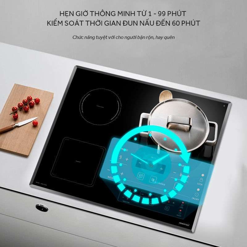 • Bếp 03 từ • Mặt kính Schott Ceran Made in Germany • Bo mạch EGO Made in Germany • Công nghệ biến tần INVERTER tiết kiệm 40% điện năng • Chức năng Booster nấu