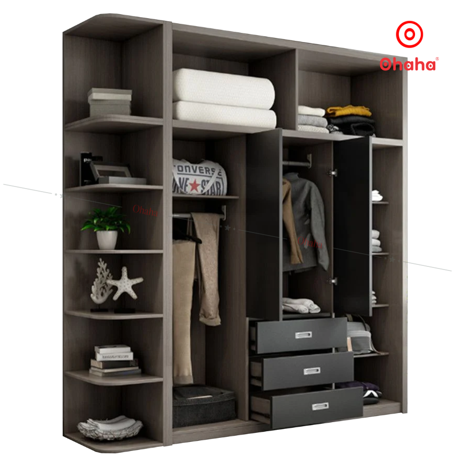 Bạn có thể lựa chọn tủ quần áo gỗ công nghiệp nhiều cánh với khối tủ nhiều ngăn kéo và khoang để lưu trữ quần áo và các vật dụng cá nhân khác. Thiết kế thông minh của tủ quần áo gỗ công nghiệp ohaha còn cho phép tùy chỉnh theo ý muốn để phù hợp với nhu cầu sử dụng của mọi gia đình.