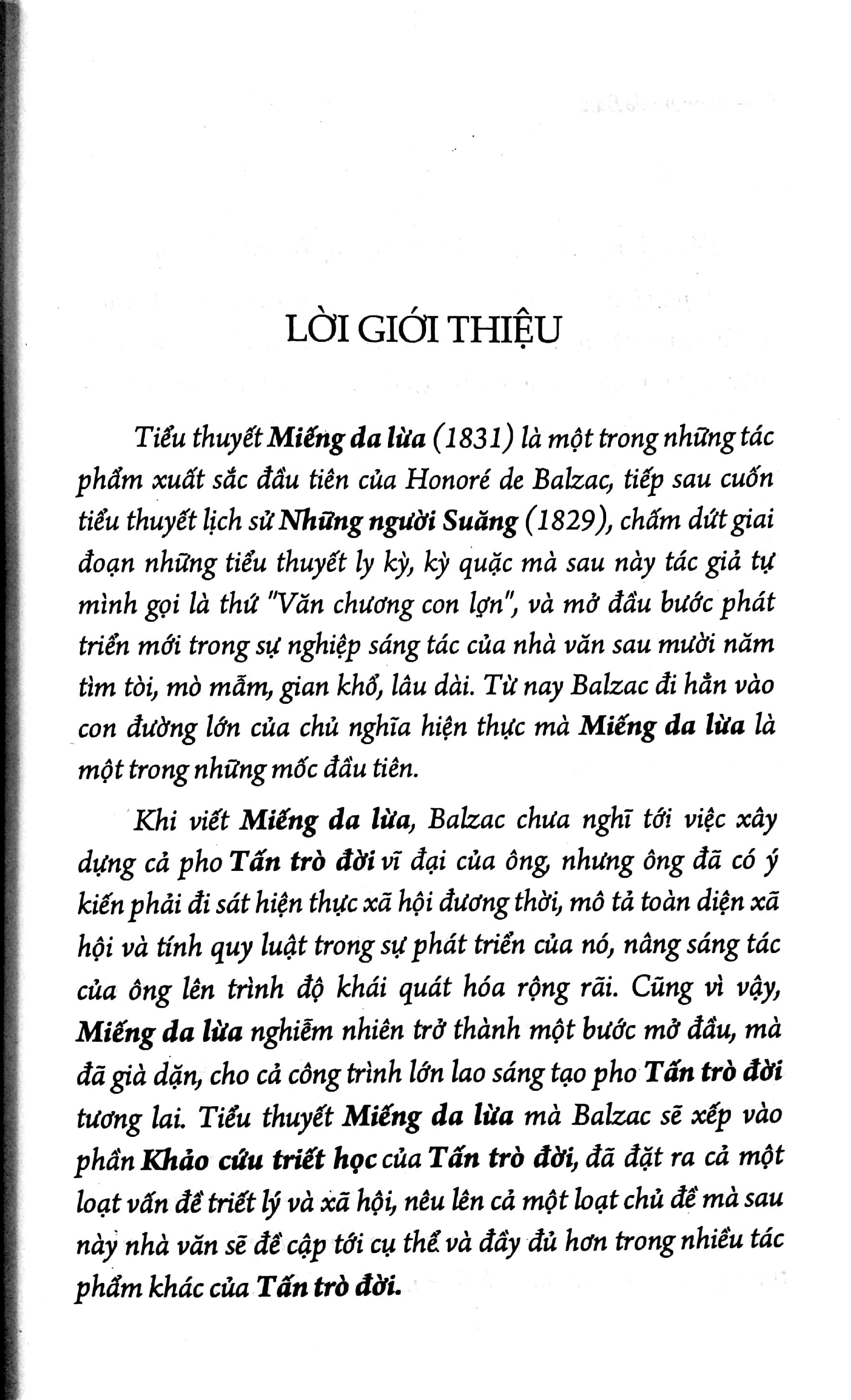 Tiểu thuyết Miếng da lừa (1831) là một trong những tác phẩm xuất sắc đầu tiên của Honoré de Balzac, tiếp sau cuốn tiểu thuyết lịch sử Những người Chouan (1829), chấm dứt giai đoạn những tiểu thuyết ly kỳ, kỳ quặc và mở đầu bước phát triển mới trong sự nghiệp sáng tác của nhà văn sau mười năm tìm tòi, mò mẫm, gian khổ, lâu dài. Từ nay Balzac đi hẳn vào con đường lớn của chủ nghĩa hiện thực mà Miếng da lừa là một trong những mốc đầu tiên.