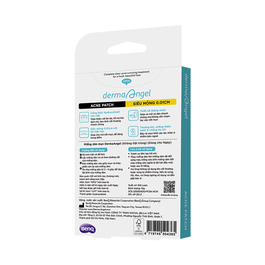 Thành phần Acrylates Copolymer, Alcohol, Vinyl Caprolactam/VP/dimethylaminoethyl Methacrylate Copolymer, Salicylic Acid, Water… Công dụng: Miếng dán giúp che phủ khỏi các tác nhân bên ngoài, giúp sạch mụn, kháng mụn, giảm đỏ. Hướng dẫn