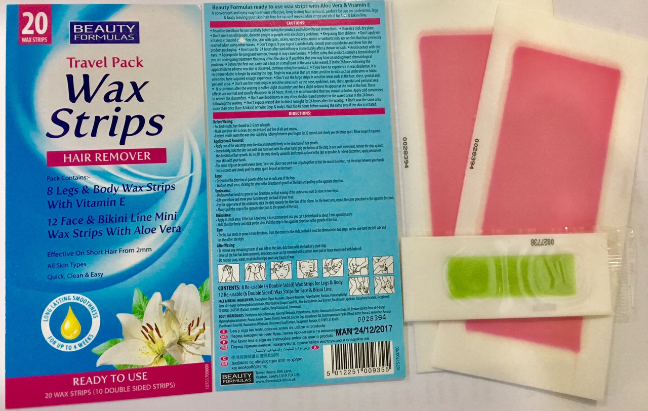 - Công dụng: Tẩy sạch lông, hạn chế lông mọc trở lại một cách tiện dụng cho vùng lông tay, chân, dưới cánh tay, mặt và bikini Mô tả sản phẩm Miếng dán tẩy lông Beauty Formulas Wax Strips Compact Travel Pact là giải pháp tối ưu thay thế cho các biện pháp loại bỏ lông thông thường như nhíp, dao cạo… giúp bạn đánh bật tận gốc các nang lông cứng đầu tại nhiều vùng trên cơ thể như: Mặt, tay, chân, vùng dưới cánh tay, đường bikini. Hướng dẫn sử dụng