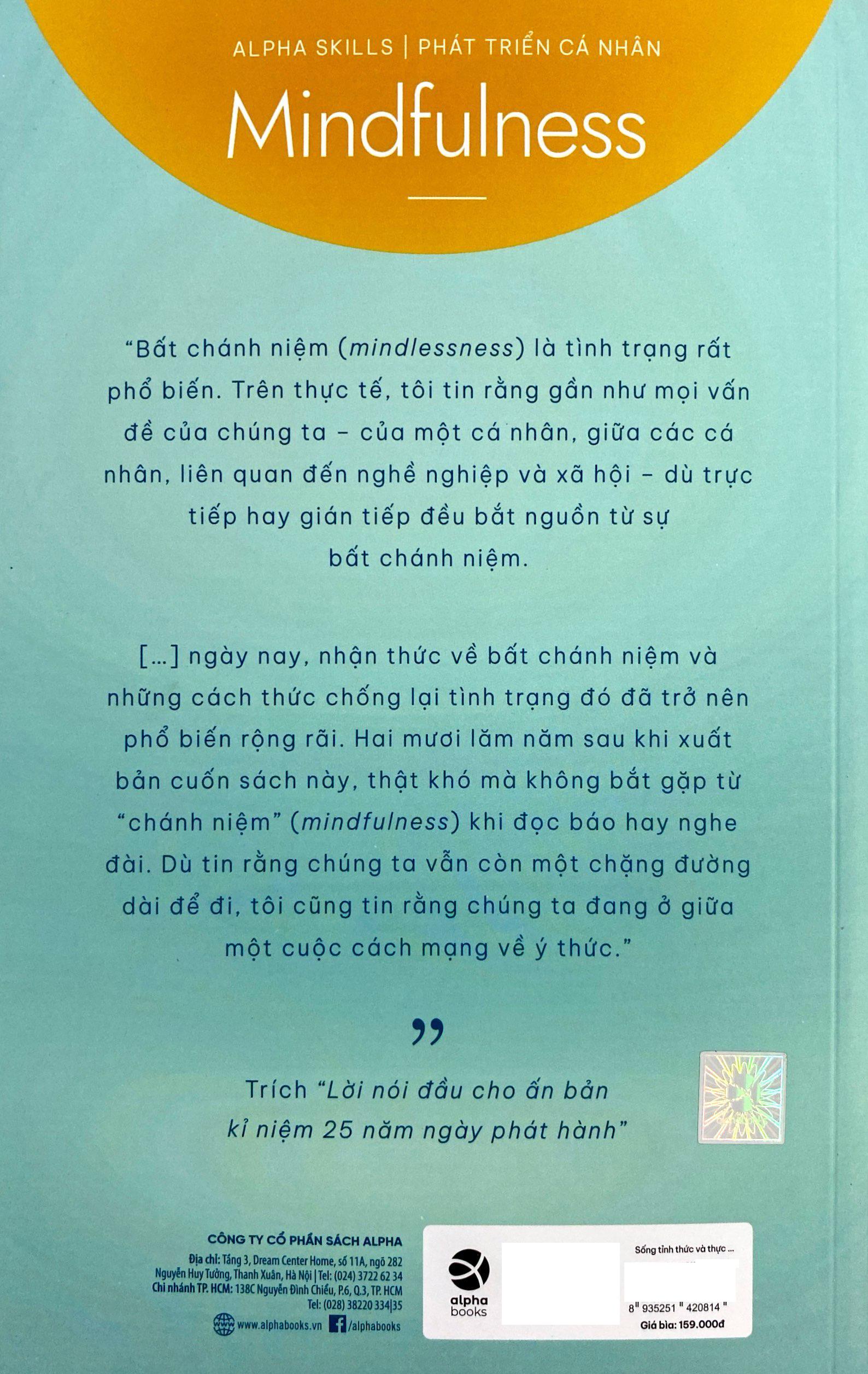 Mindfulness - Sống Tỉnh Thức Và Thực Hành Chánh Niệm Cuốn sách mang tính cách mạng cho thấy cách áp dụng chánh niệm vào mọi khía cạnh trong cuộc sống của chúng ta. Giải thích “chánh niệm” dưới góc nhìn của khoa học phương Tây, mang tới nhiều nghiên cứu mới về sự tác động giữa hành vi và ý thức của con người. Lý thuyết của Langer đã được áp dụng cho nhiều lĩnh vực, bao gồm sức khỏe, kinh doanh, lão hóa, công bằng xã hội và học tập. Nội dung chính: Chương 2 xem xét bản chất của bất chánh niệm và so sánh với các khái niệm tương tự như thói quen và vô thức. Chương 3 khám phá nguyên nhân của tình trạng bất chánh niệm, bao gồm vai trò quan trọng của bối cảnh và bản chất của những gì chúng ta tiếp nhận khi còn nhỏ. Tổng quan về cái giá phải trả cho sự bất chánh niệm, những giới hạn mà nó gây ra đối với các kĩ năng cũng như kì vọng và tiềm năng của chúng ta là nội dung của chương 4. Chương 5, thảo luận về bản chất của chánh niệm và so sánh với các khái niệm liên quan trong triết học phương Đông. Các chương từ 6 đến 10 trình bày về những ứng dụng của nghiên cứu chánh niệm trong năm khía cạnh lớn của cuộc sống thường ngày: quá trình lão hoá, sự sáng tạo, công việc, vấn đề định kiến và sức khỏe.
