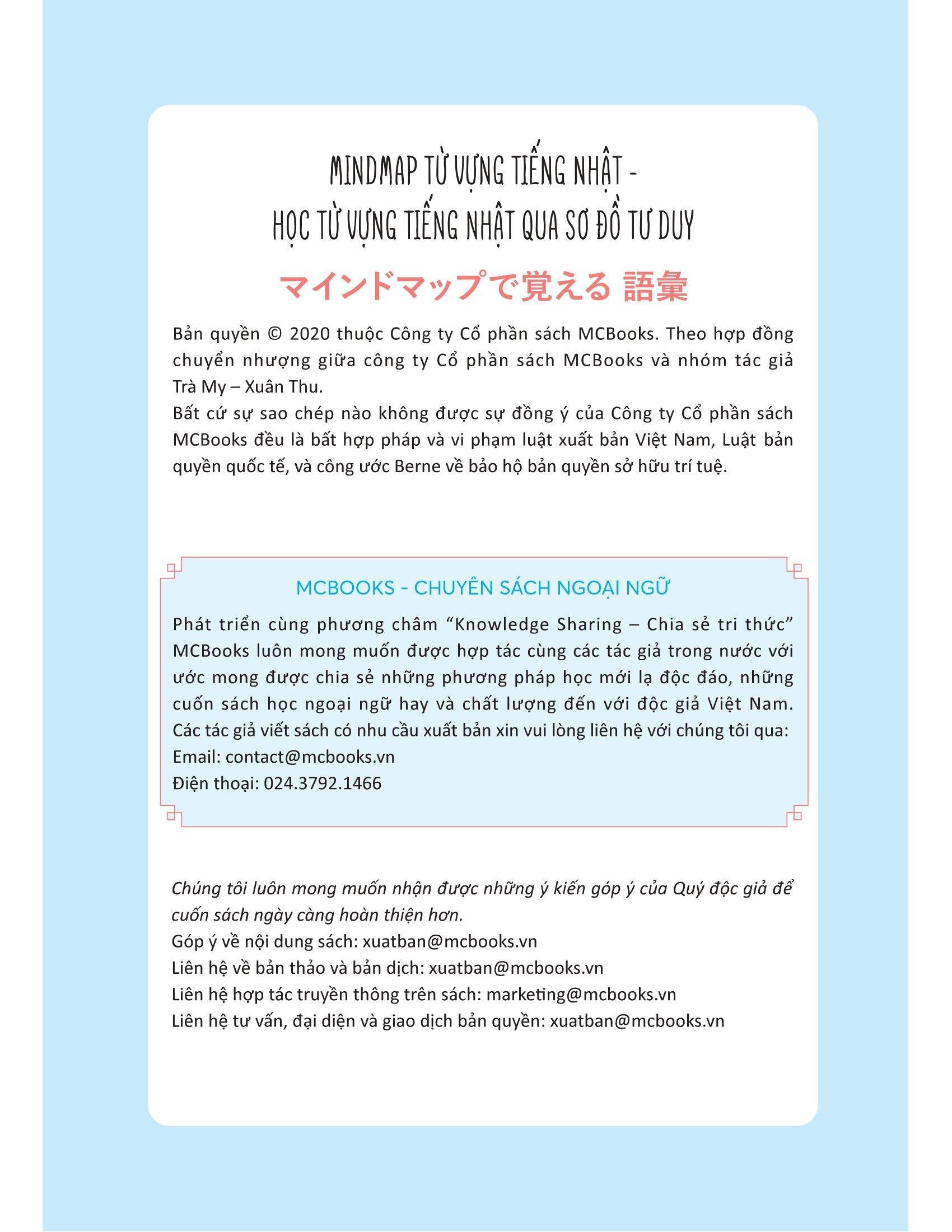 Mindmap Từ Vựng Tiếng Nhật - Học Từ Vựng Tiếng Nhật Qua Sơ Đồ Tư Duy Nhà xuất bản : Nhà Xuất Bản Dân Trí. Công ty phát hành : MCBooks. Tác giả : Xuân