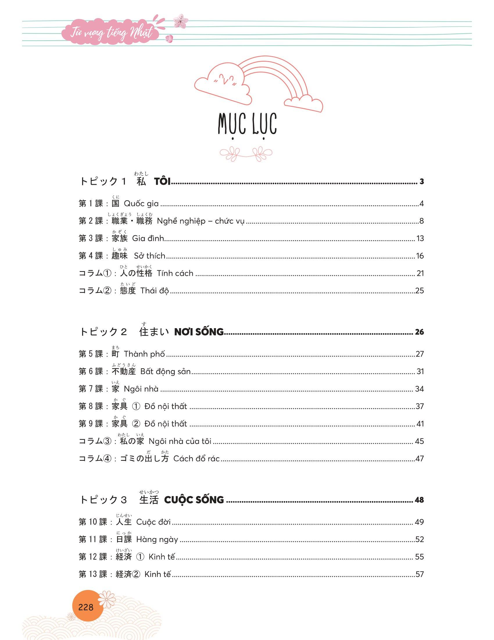 Với cuốn sách, người đọc sẽ nắm chắc hệ thống những từ tiếng Nhật thông dụng, dễ dàng học tập và tra cứu để có đủ vốn từ trong giao tiếp và trong học tập, ôn thi năng lực tiếng Nhật.