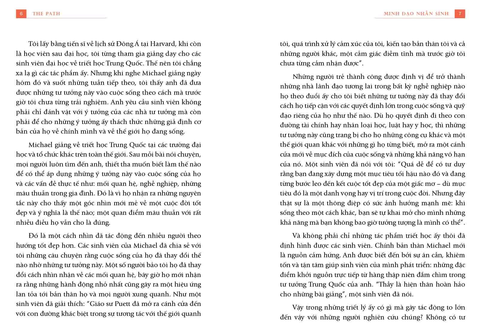 Trong cuốn sách “Minh đạo nhân sinh”, GS. Michael Puett đã hệ thống, giảng giải những triết lý của các triết gia Phương Đông dễ hiểu một cách đáng kinh ngạc. Michael Puett chỉ ra rằng, từ 2.000 năm trước, các triết gia Trung Hoa cổ đại như Khổng Tử, Lão Tử, Mạnh Tử, Trang Tử, Tuân Tử, Quản Tử … đã có những phát kiến tuyệt vời về việc phát triển con người và thay đổi xã hội một cách hài hòa, tích cực.