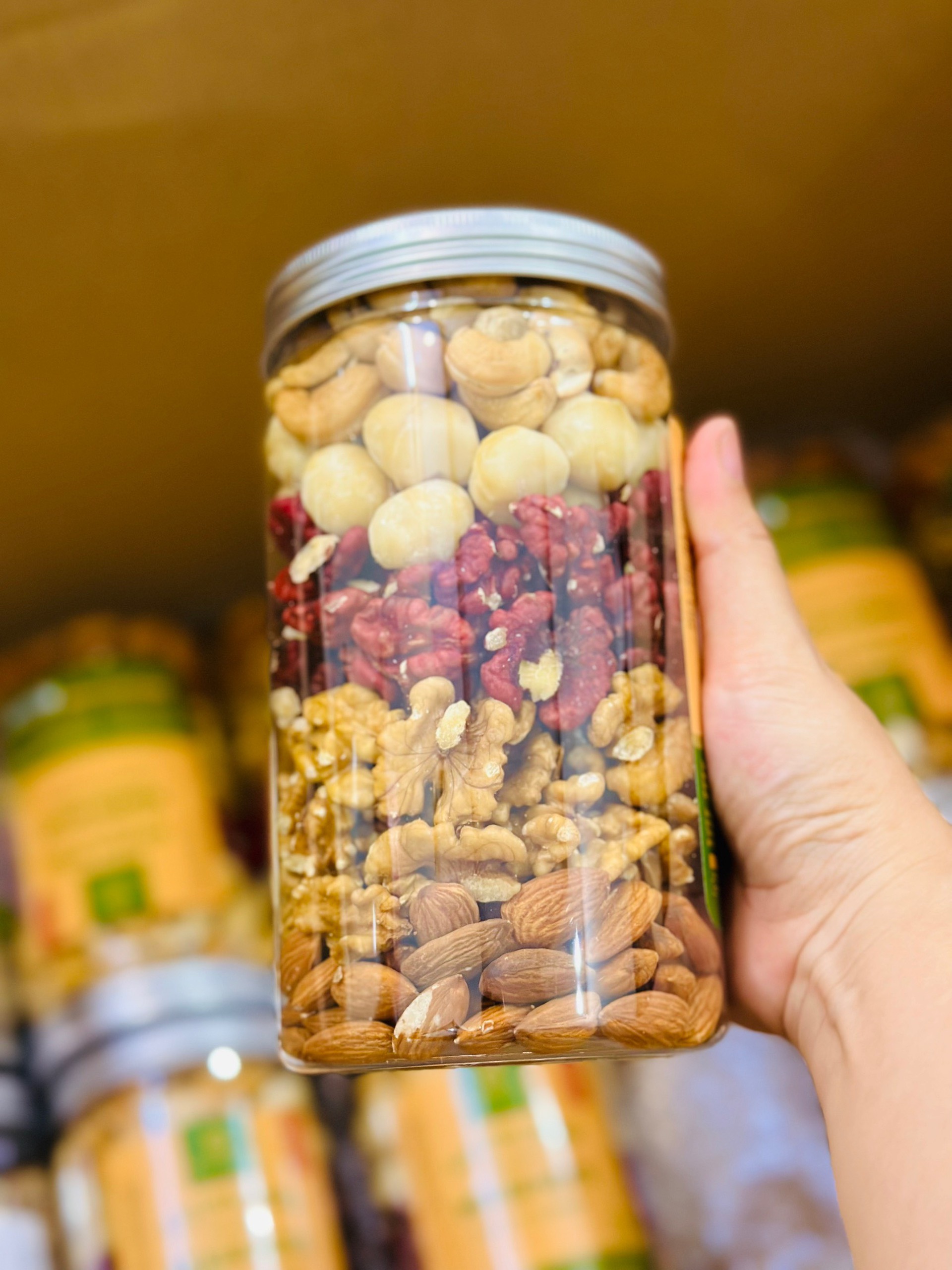 Thành phần: Nhân óc chó vàng, nhân óc chó đỏ, nhân macca, hạt hạnh nhân, hạt điều.