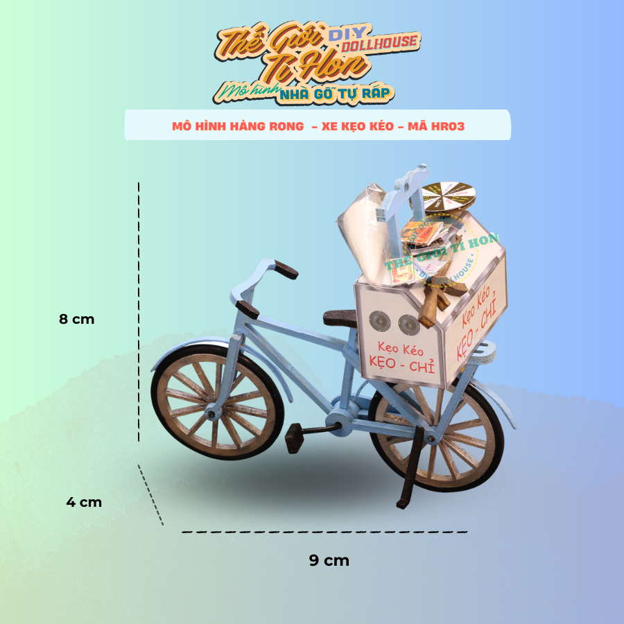 Khách lưu ý: SẢN PHẨM TỰ SƠN VÀ LẮP RÁP SẢN PHẨM CHƯA BAO GỒM KEO DÁN CHUYÊN DỤNG, PIN VÀ DỤNG CỤ LẮP RÁP (NHÍP, DAO RỌC GIẤY, KÉO,...) SẢN PHẨM KHÔNG ÁP DỤNG ĐỔI TÊN BẢNG HIỆU GIÁ SẢN PHẨM CHƯA BAO GỒM THUẾ VAT, KHÁCH CẦN XUẤT VAT XIN VUI LÒNG LIÊN HỆ THẾ GIỚI TÍ HON QUA CHATBOX Mô Hình Xe Hàng Rong Tuổi Thơ Sài Gòn - Xe Kẹo Kéo - HR03 ** ĐƠN HÀNG XE HÀNG RONG KHÔNG ÁP DỤNG FREESHIP Kẹo kéo là món ăn vặt được các bạn học sinh rất ưa thích. Để hấp dẫn trẻ em, người bán thường đổi kẹo lấy dép, các loại phế liệu, hoặc chỉ đơn giản là những trò chơi nho nhỏ như cây súng gỗ, chiếc bàn quay số đơn giản, quay trúng số nào hoặc bắn trúng ô nào thì sẽ nhận được phần kẹo tương ứng... Mô hình Xe Kẹo Kéo Sài Gòn Xưa Thu Nhỏ - HR03 Tìm Hiểu Mô Hình Tí Hon Thông số mô hình Đánh giá độ khó Kích thước sản phẩm  9.0 x 4.0 x 8.0 CM (Dài x Rộng x Cao) Xuất xứ VIỆT NAM Cân nặng  0.2 Kg Nguyên vật liệu Gỗ, hoa cỏ khô, vải, giấy, kim loại, đèn Led, gốm sứ,nhựa,... Sản phẩm bao gồm Hộp Pin có công tắt, nguyên vật liệu lắp ráp, sách hướng dẫn.  Phụ kiện làm mô hình (Mua riêng): Keo chuyên dụng + Mica Che Bụi + Bộ dụng cụ Kit...()  Shop hỗ trợ lắp ráp luôn nếu bạn có nhu cầu (có phụ phí)
