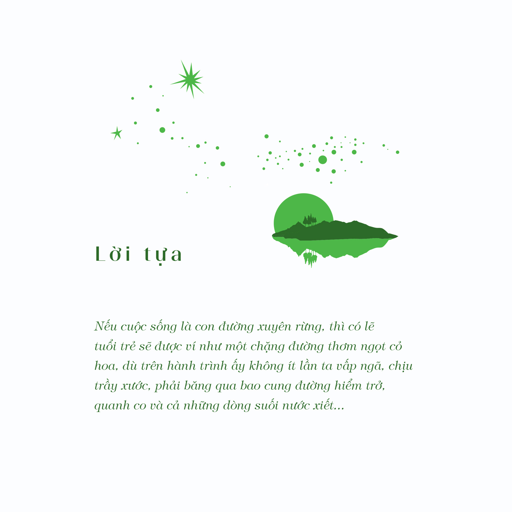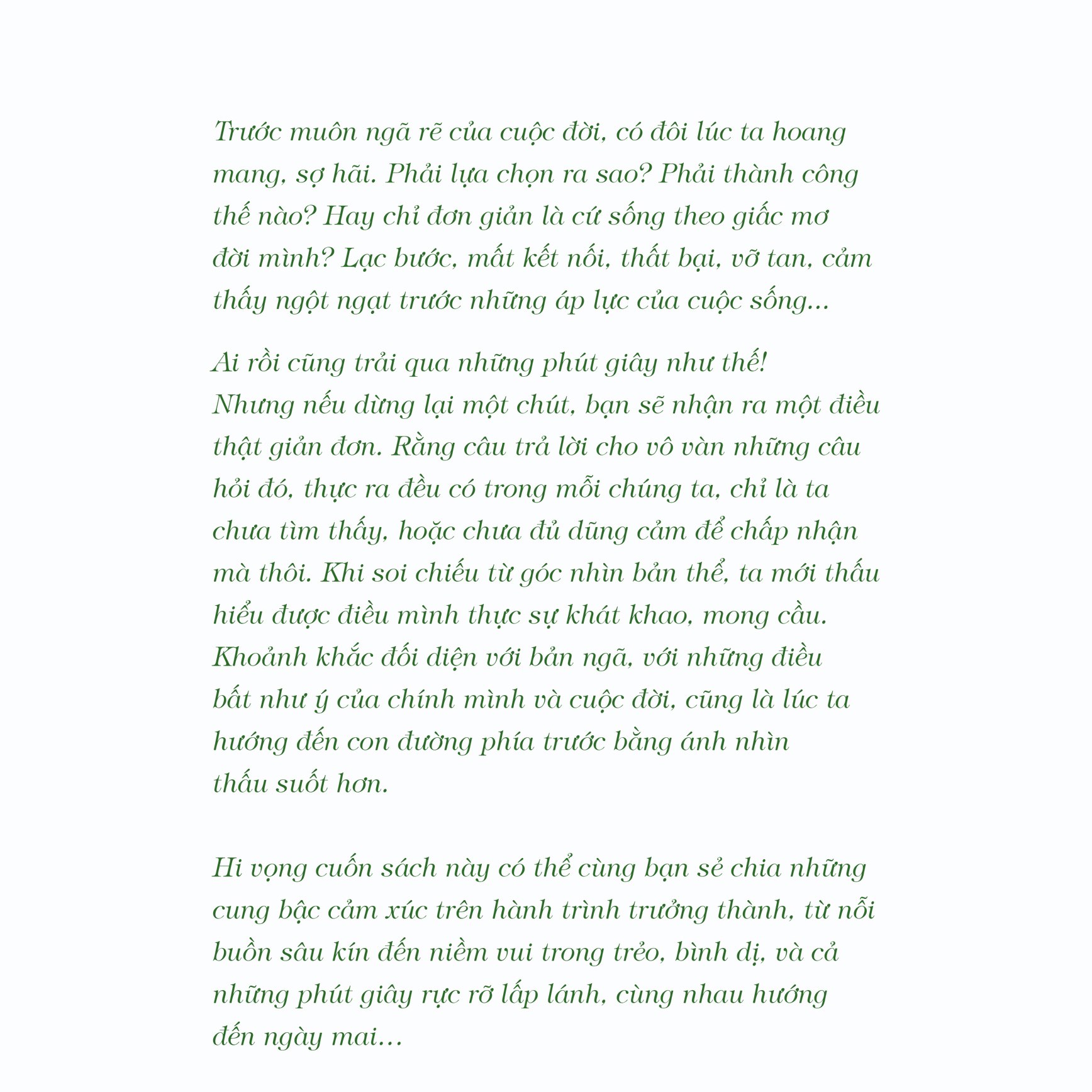 Cuốn sách này sẽ cùng bạn sẻ chia rất nhiều cung bậc cảm xúc trên hành trình trưởng thành, từ những nỗi buồn sâu kín đến niềm vui trong trẻo, bình dị, và cả những phút giây rực rỡ, lấp lánh… Đến cuối hành trình, ta chợt nhận ra một điều thật giản đơn. Rằng phải chăng những sóng gió, trở ngại không ngừng xuất hiện trong cuộc sống này là để mang đến cho chúng ta bài học lớn nhất: Đời người khi đối diện với gian nan, nhất định phải dựa vào chính mình.