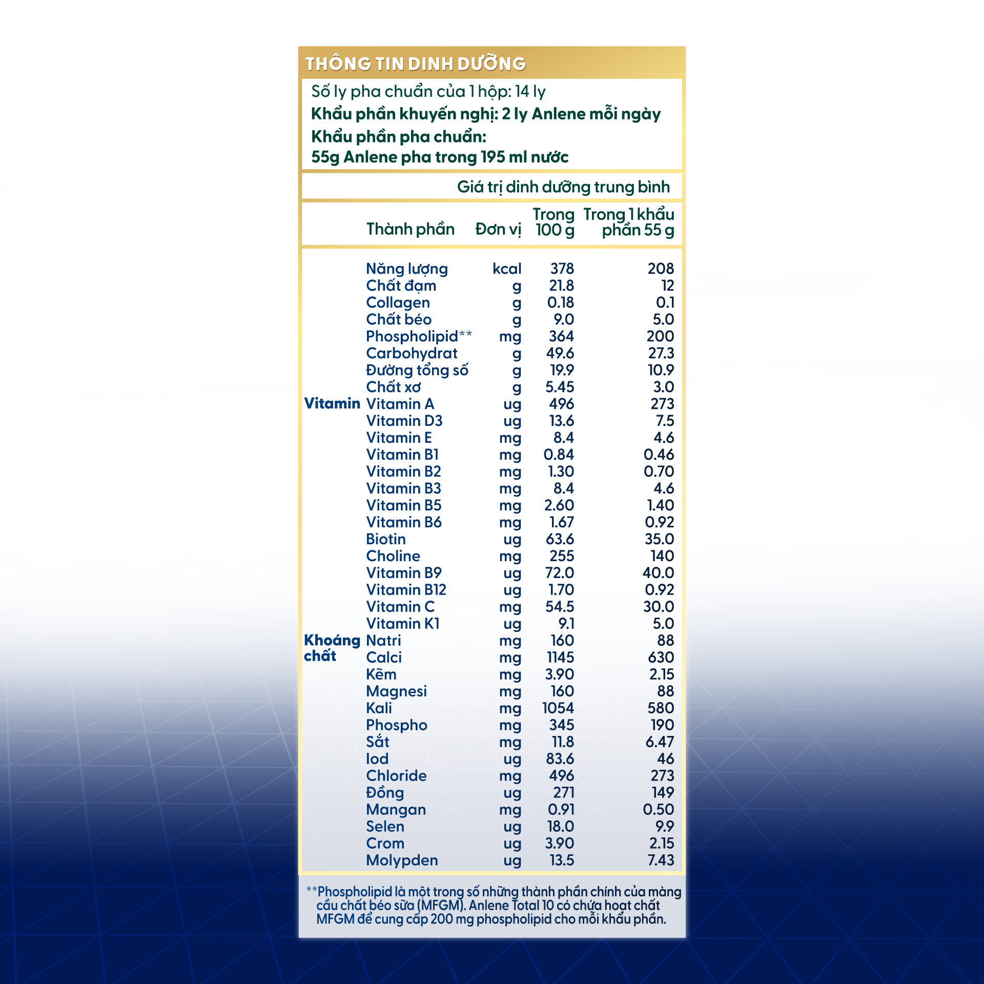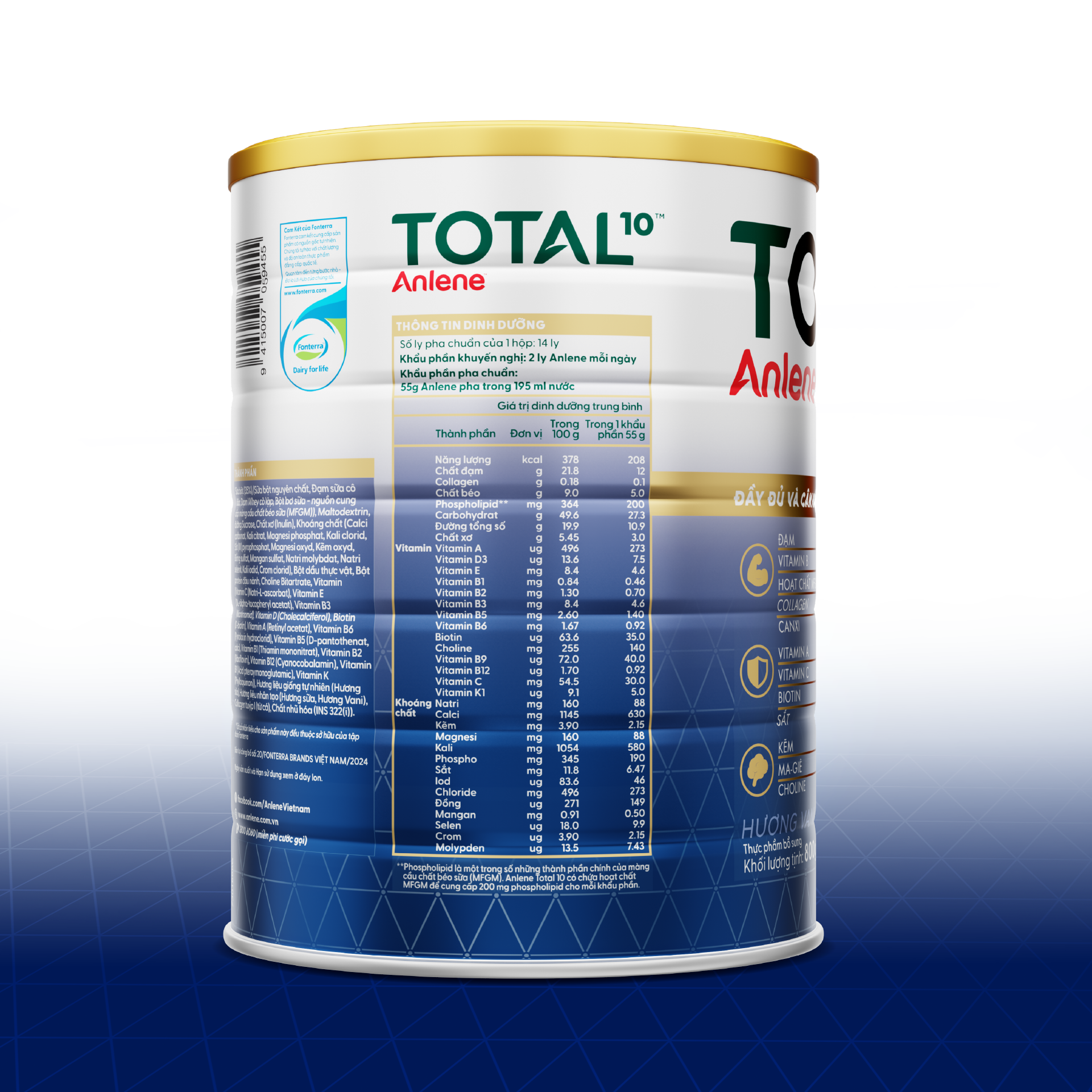 ĐẶC ĐIỂM NỔI BẬTAnlene Total 10 mới với công thức TOTAL MAX được điều chế đặc biệt. Với 27 Vitamin và khoáng chất và chứa Lactose thấp, giúp bổ sung hệ dưỡng chất cho vận động, đề kháng, não, tiêu hóa bao gồm: • Đạm • Canxi • Collagen và Vitamin C • Vitamin B • Hợp chấy MFGM • Vitamin A • Kẽm • Magiê • Biotin • Prebiotic