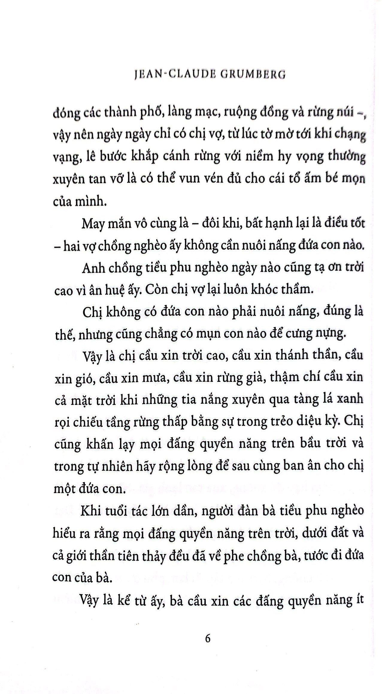 Tại một cánh rừng rậm rạp, nơi cái đói và giá lạnh khủng khiếp ngự trị, có hai vợ chồng tiều phu nghèo sinh sống. Tuổi tác càng lớn, bà tiều phu càng mong mỏi có một mụn con, là điều bà vẫn ngày ngày cầu xin thần linh chốn rừng già. Cũng tại nơi ấy, một tuyến đường độc đạo cắt qua chở theo chuyến “tàu hàng” mang đến niềm vui và sự mong chờ duy nhất cho cuộc sống đơn điệu của bà. Bỗng một ngày như bao ngày khác, chuyến tàu giấc mơ ban cho bà một “món hàng quý giá” – một đứa trẻ được bọc trong chiếc khăn san xa xỉ và đẹp nhất mà bà từng thấy.
