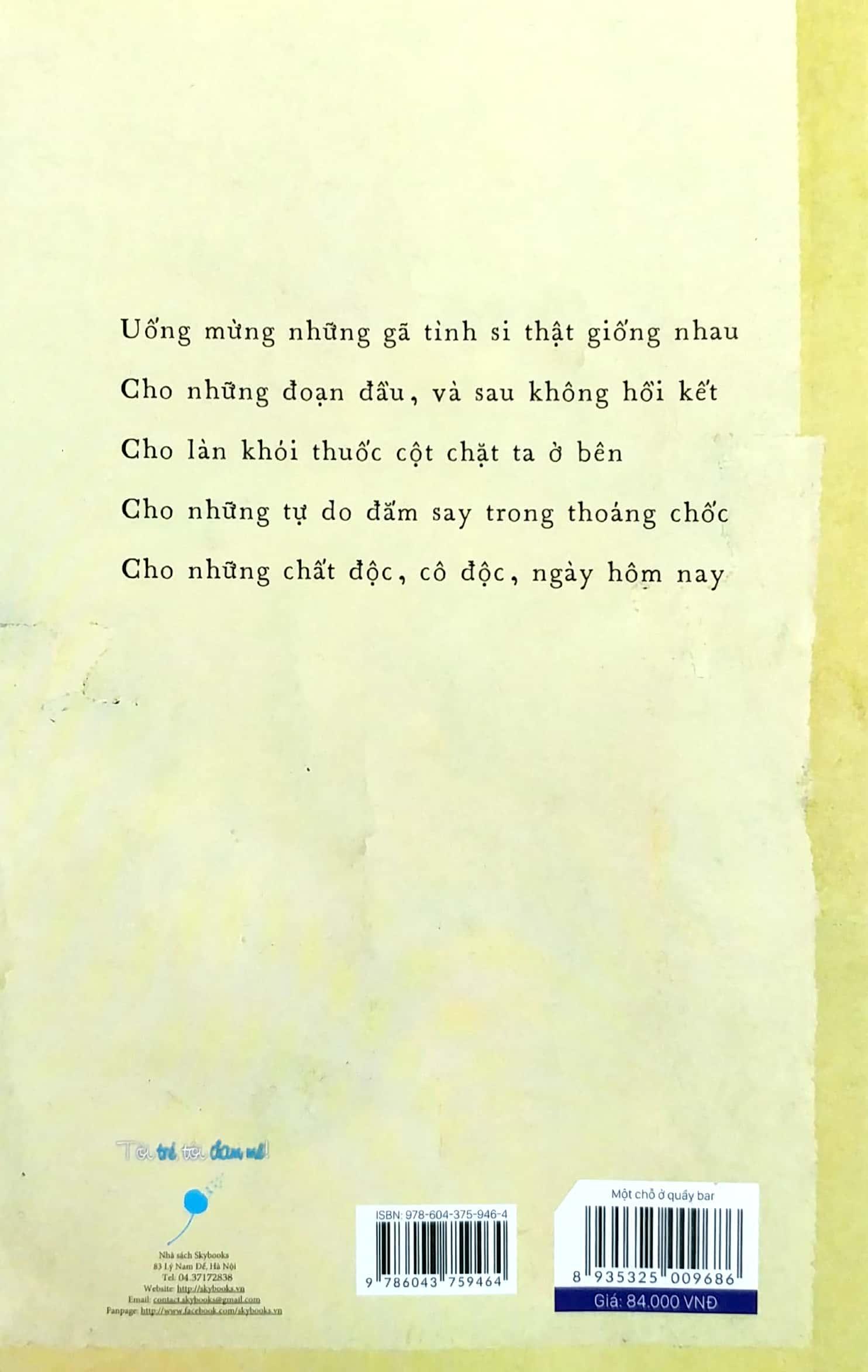 Những dòng thơ da diết đánh dấu sự quay trở lại của nàng thơ Trịnh Nam Trân vào một ngày đông lạnh. Trân đưa bạn lạc vào một “quầy bar”, nơi cô nhẹ nhàng “mời bạn một ly vang tình” để một lần được say mèm trong men hơi yêu thương.