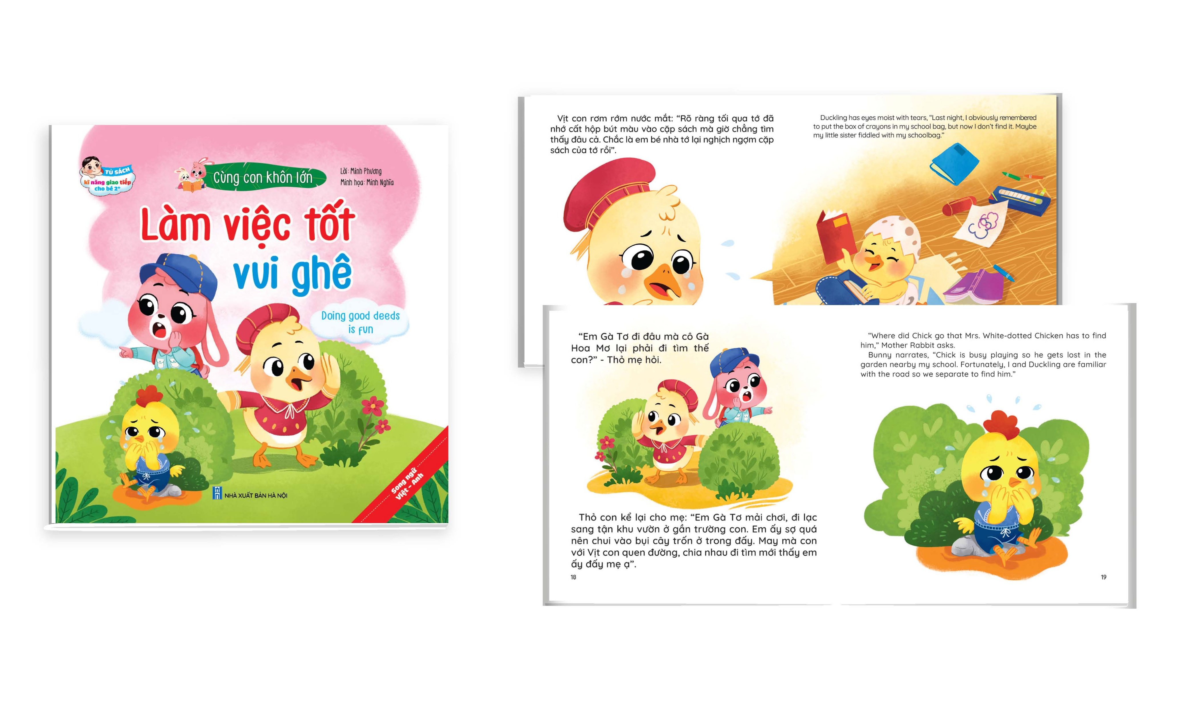Bộ truyện tranh kĩ năng giao tiếp “Cùng con khôn lớn” – song ngữ Việt Anh Với những câu chuyện ngắn xoay quanh cuộc sống gia đình, bạn bè, trường lớp của các em nhỏ, nội dung đơn giản, dễ hiểu, đồng thời ẩn chứa những lời động viên, an ủi ấm áp nhất của bố mẹ dành cho con khi con cảm thấy buồn vì thua cuộc, thất bại. Những lời khuyên bảo, dạy dỗ con nói lời cảm ơn, xin lỗi, chia sẻ với bạn bè … một cách nhẹ nhàng để con hiểu và tự tin hơn vào bản thân, vượt qua được mọi khó khăn, thử khách trong cuộc sống.