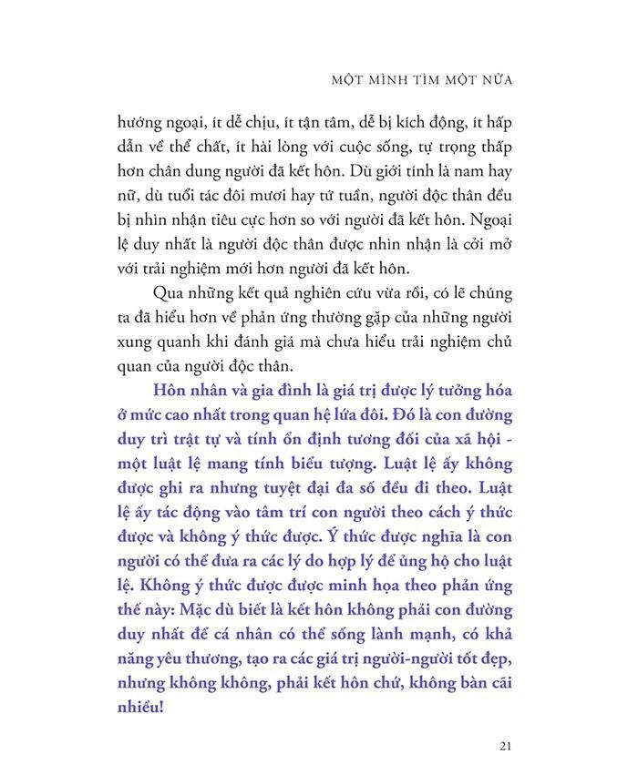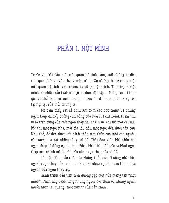 Cuốn sách này sẽ đồng hành cùng tất cả chúng ta - những người còn độc thân, đang phân vân trước ngã rẽ tình cảm, hoặc đã ở trong một mối quan hệ đôi lứa - trên hành trình hiểu về tình yêu và hiểu về chính mình. Vì hạnh phúc không chỉ có một dáng vẻ duy nhất.