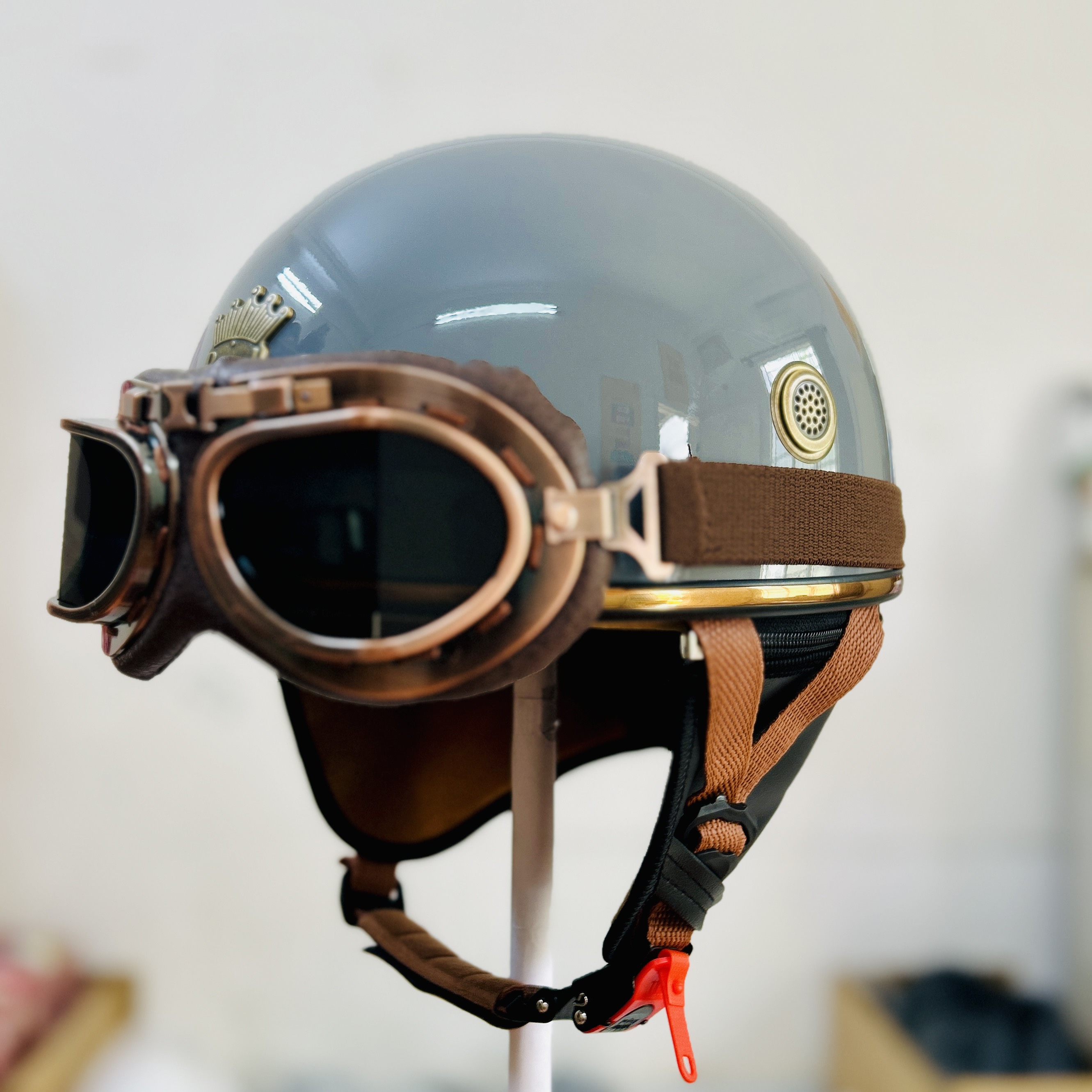 Mũ bảo hiểm nửa đầu freesize Rona hali viền bạc kèm kính phi công bạc Mũ bảo hiểm nửa đầu Rona haly viền bạc kèm kính phi công bạc cho nam và nữ đi xe