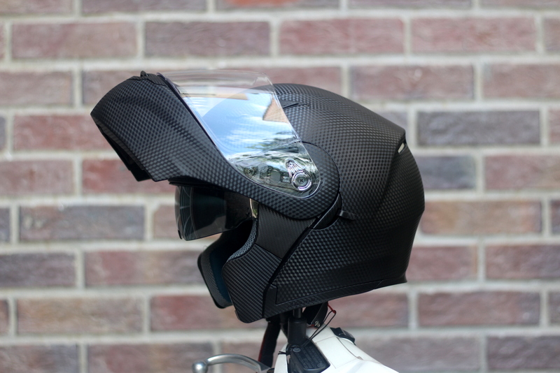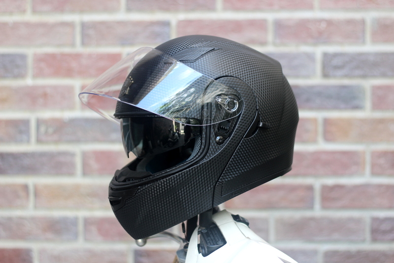 Royal M179 với thiết kế lật hàm sơn vân carbon vô cùng độc đáo giúp ae linh động thay đổi từ một chiếc fullface sang kiểu 3/4 khá dễ dàng. Vỏ bằng nhựa ABS nguyên