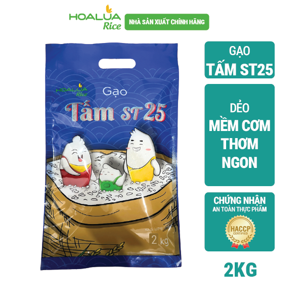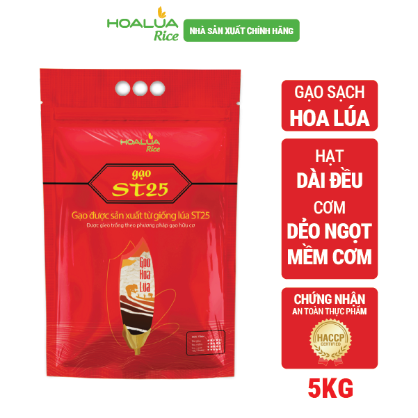 Gạo ST25 Hoa Lúa sản xuất từ giống lúa thơm phẩm chất thượng hạng của vùng Sóc Trăng, được vinh danh là gạo Ngon nhất Thế giới năm 2019 và 2023. ĐẶC TÍNH: Gạo ST25 Hoa Lúa với hạt gạo thon dài, đều và trắng trong, không bạc bụng. Cơm chín cơm mềm dẻo, có mùi thơm đặc trưng. Khi để nguội cơm vẫn giữ được độ ngon và dẻo, không bị khô cứng. Đóng gói theo tiêu chuẩn Châu Âu HACCP. HƯỚNG DẪN SỬ DỤNG: