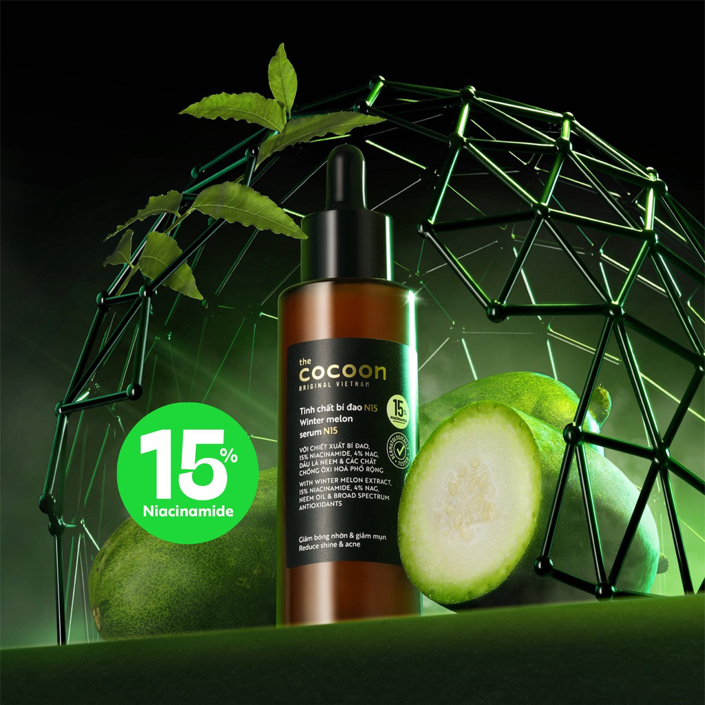 Mua tại TiktokTinh chất bí đao N15 (15% niacinamide) dành cho da dầu mụn và nhạy cảm Cocoon 70ml Một công thức mạnh mẻ với chiết xuất bí đao, 15% niacinamide tinh khiết, 4% NAG phối hợp cùng dầu lá neem và các chất ngừa ôx.y hoá phổ rộng mạng lại khả năng bảo vệ làn da khỏi các gố.c tự do phản ứng (ROS, RNS, RCS), giảm bóng nhờn và cải thiện tình trạng mụn. Công dụng