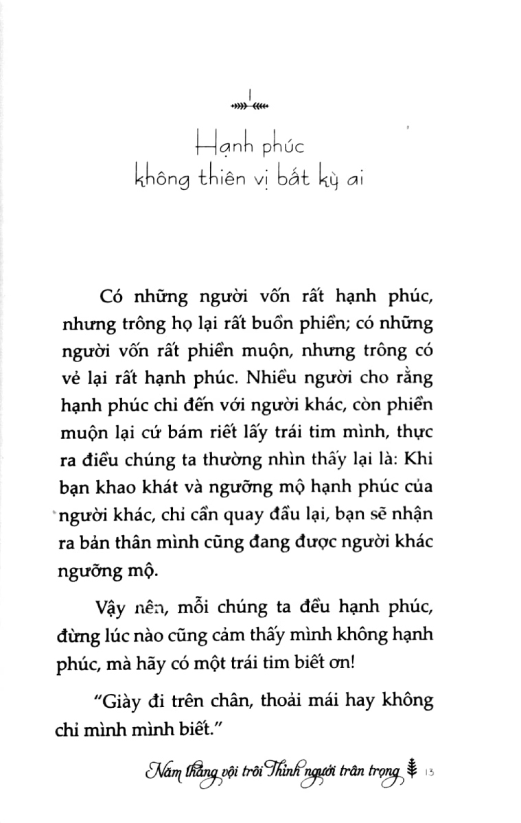 Cuốn sách “Năm tháng vội trôi, thỉnh người trân trọng” là "bản vẽ" phác họa nên chân dung của hạnh phúc. Là sự giác ngộ về hạnh phúc tại tâm. Nhân gian hữu hạn, thời gian hữu hạn, quyền lựa chọn trong tay mỗi người, hà cớ giao phó hạnh phúc cuộc đời mình vào bàn tay người khác? Hiểu được điều trân quý nhất thế gian là thời gian mà trân trọng hiện tại .