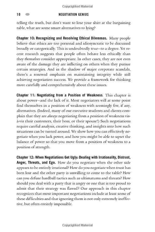 From two leaders in executive education at Harvard Business School, here are the mental habits and proven strategies you need to achieve outstanding results in any negotiation. Whether you’ve “seen it all” or are just starting out, Negotiation Genius will dramatically improve your negotiating skills and confidence. Drawing on decades of behavioral research plus the experience of thousands of business clients, the authors take the mystery out of preparing for and executing negotiations—whether they involve multimillion-dollar deals or improving your next salary offer. What sets negotiation geniuses apart? They are the men and women who know how to: - Identify negotiation opportunities where others see no room for discussion - Discover the truth even when the other side wants to conceal it - Negotiate successfully from a position of weakness - Defuse threats, ultimatums, lies, and other hardball tactics - Overcome resistance and “sell” proposals using proven influence tactics - Negotiate ethically and create trusting relationships—along with great deals - Recognize when the best move is to walk away - And much, much more This book gets “down and dirty.” It gives you detailed strategies—including talking points—that work in the real world even when the other side is hostile, unethical, or more powerful. When you finish it, you will already have an action plan for your next negotiation. You will know what to do and why. You will also begin building your own reputation as a negotiation genius .