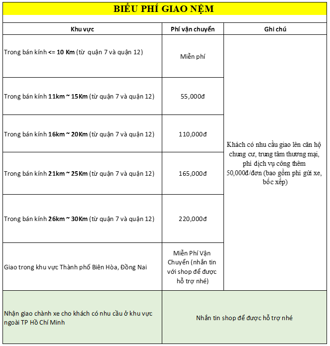 - Miễn phí giao hàng phạm vi 10KM từ Quận 7 và Quận 12, địa chỉ nhận hàng của quý khách trên 10KM phụ thu phí ship như sau: