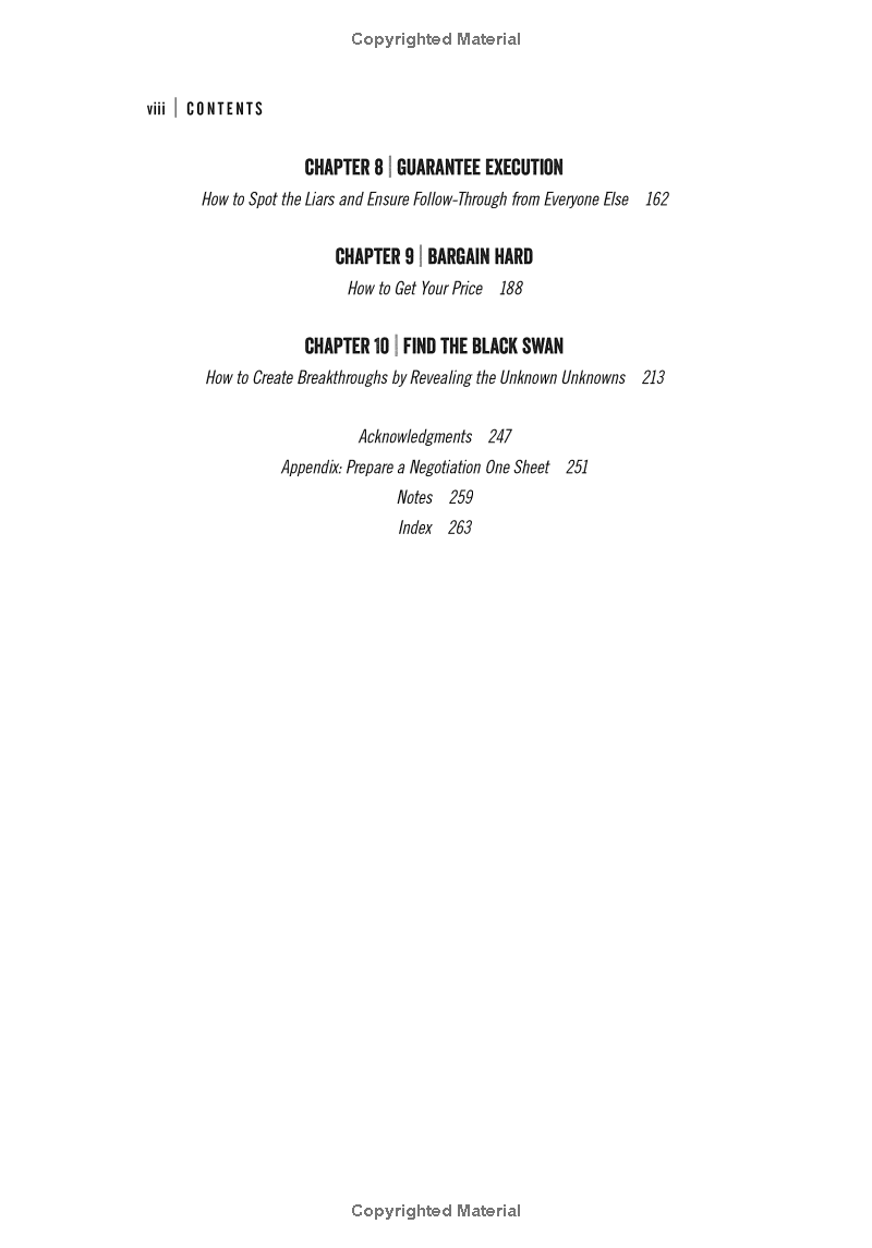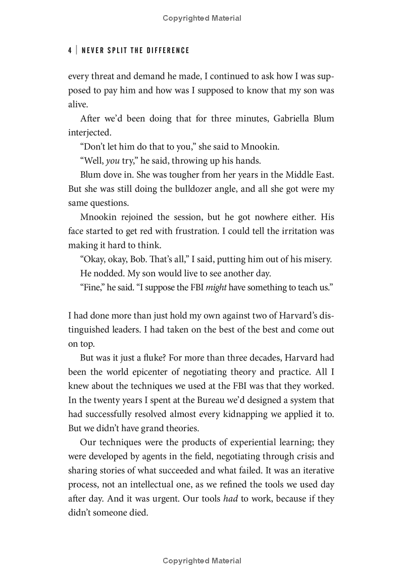 Never Split the Difference is a riveting, indispensable handbook of negotiation principles culled and perfected from Chris Voss's remarkable career as a hostage negotiator and later as an award-winning teacher in the world's most prestigious business schools. From policing the rough streets of Kansas City, Missouri, to becoming the FBI's lead international kidnapping negotiator to teaching negotiation at leading universities, Voss has tested these techniques across the full spectrum of human endeavor and proved their effectiveness. Those who have benefited from these techniques include business clients generating millions in additional profits, MBA students getting better jobs, and even parents dealing with their kids.