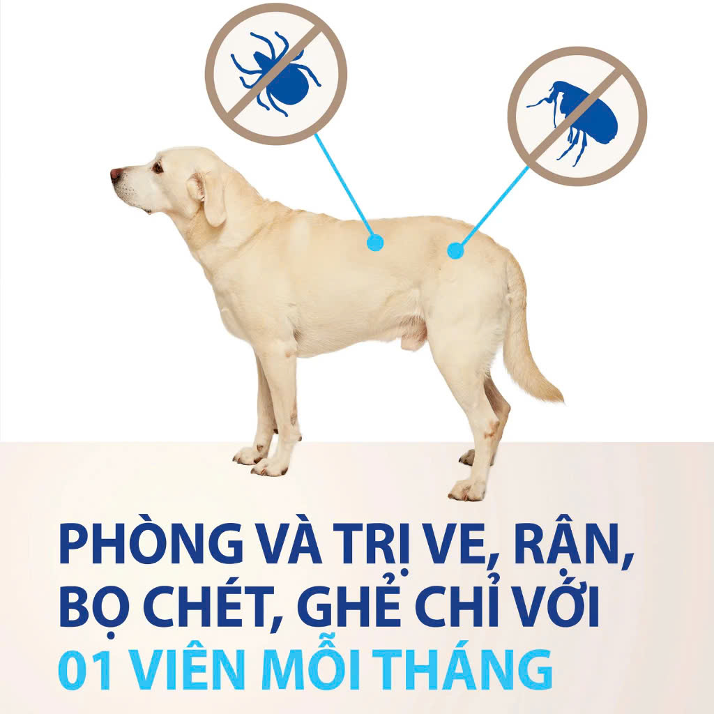 - Viên nhai Bravecto diệt ghẻ, ve rận, bọ chét trên chó. - Hiệu quả kéo dài trong suốt 12 tuần. - Giúp lông da bóng mượt, không còn mùi hôi. - An toàn trên
