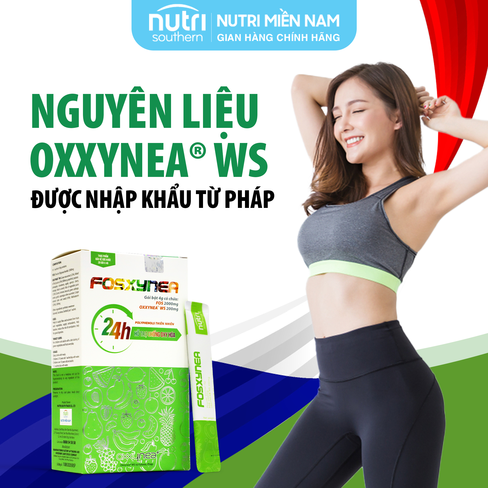 OXXYNEA WS (Chiết xuất trà xanh (23%); Hỗn hợp trái cây (23%) (quả mâm xôi, bưởi, đu đủ, dứa, dâu, táo, mơ, anh đào, cam, lý chua đen); Hỗn hợp rau củ (12%) (Cà rốt, cà chua, bông cải xanh, bắp cải xanh, hành tây, tỏi, măng tây, dưa chuột, ô liu); Chiết xuất nho (hạt nho và thịt nho) (10%; Maltodextrin (32%)): 200mg.