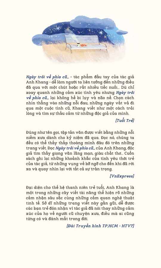 "Ngày Trôi Về Phía Cũ... - tác phẩm đầu tay của tác giả Anh Khang - dễ làm người ta liên tưởng đến những điều đã qua với một chút hoặc rất nhiều tiếc nuối... Dù chỉ xoay quanh những cảm xúc tình yêu nhưng Ngày trôi về phía cũ... lại không hề bi lụy và não nề. Chọn cách nhìn thẳng vào những nỗi đau, những ngày vất vả đi qua một cuộc tình cũ, Khang viết như một cách trải lòng và tìm sự thấu cảm từ những độc giả của mình." (Tuổi Trẻ)